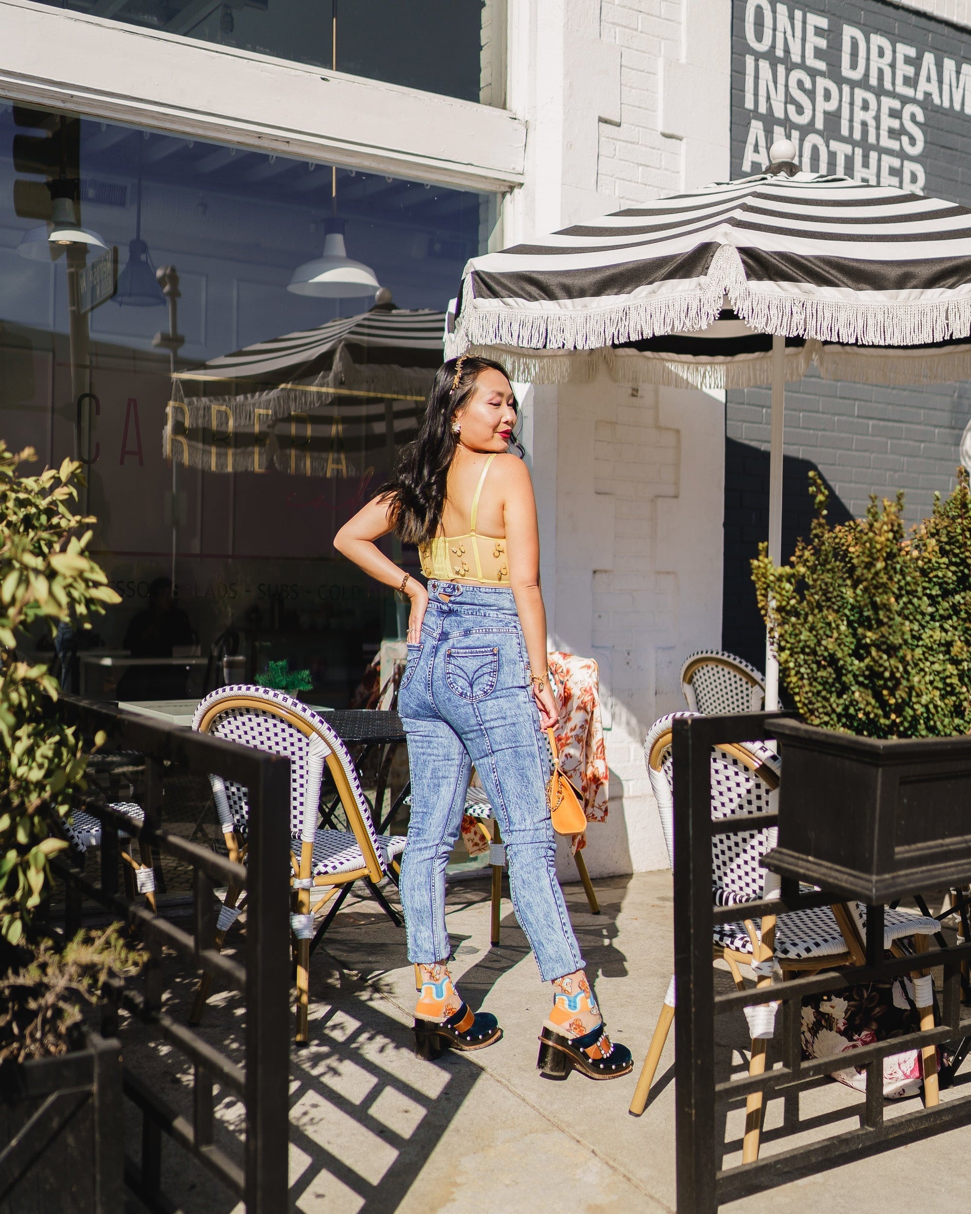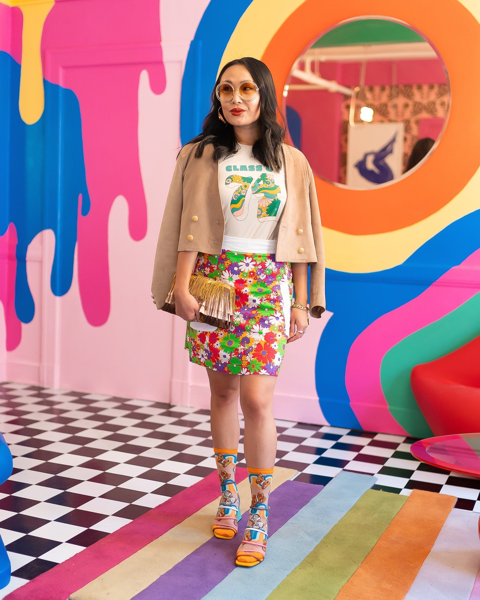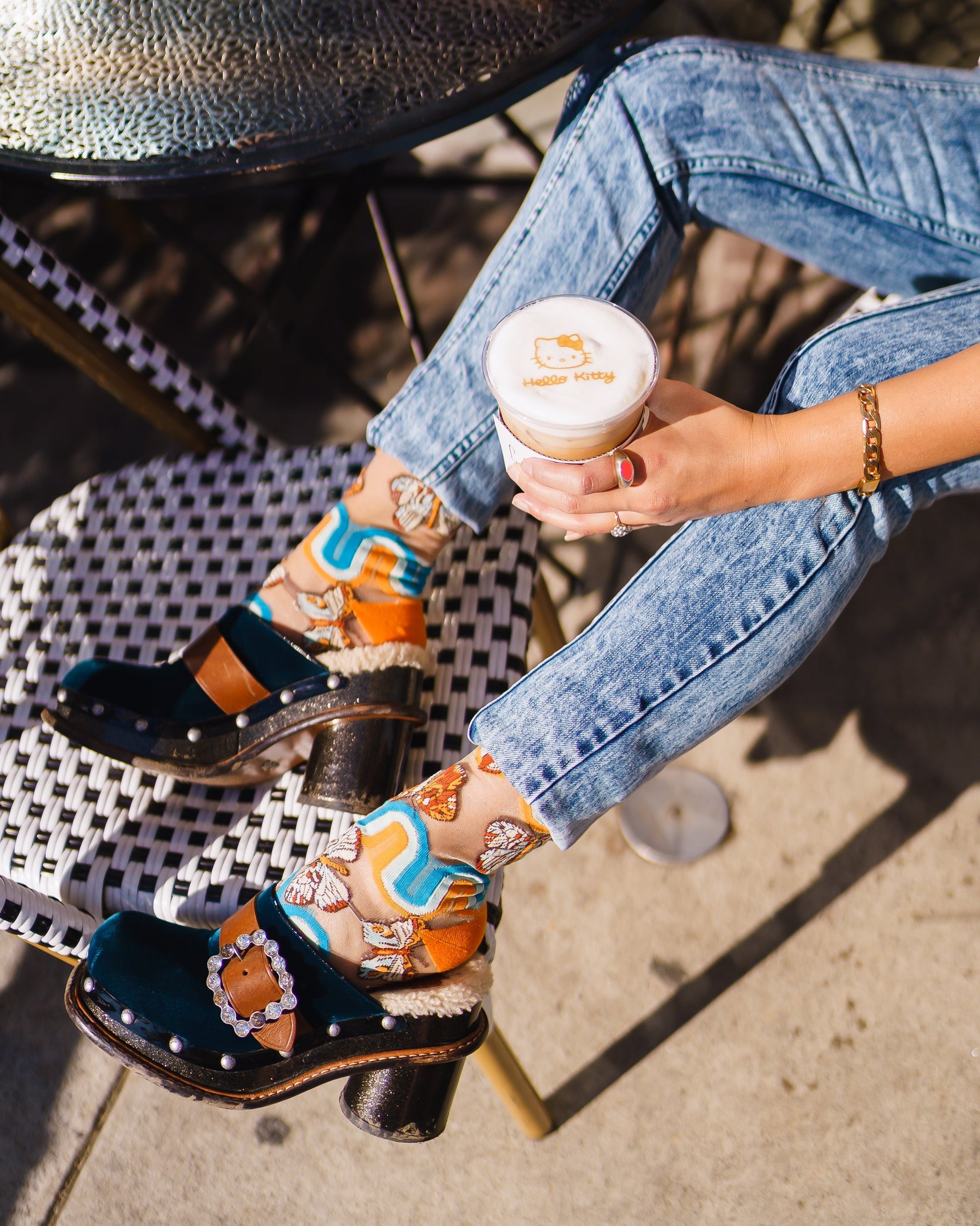 Our one year anniversary sock is inspired by the '70s and features oh-so-groovy rainbows mixed with whimsical butterflies, paying homage to our first ever Sock Candy design the Polka Dot Ruffle Butterfly sock! Set against a nude sheer fabric, this statement '70s sock adds color, texture, and a pop of vintage to your look.Â