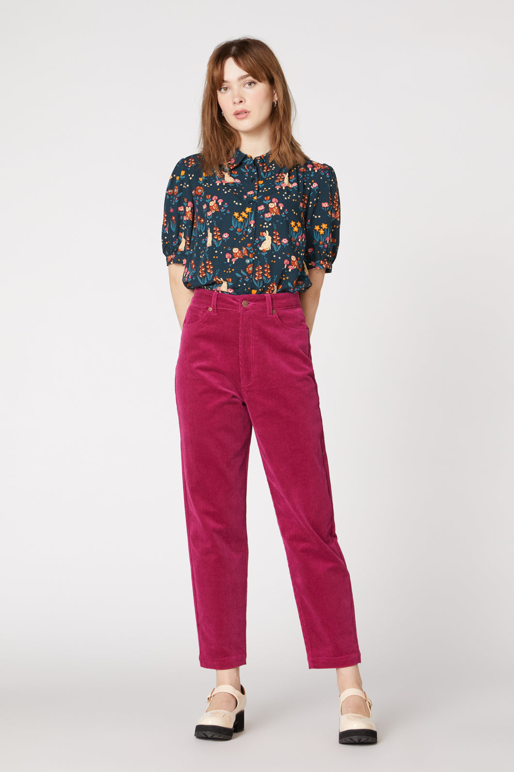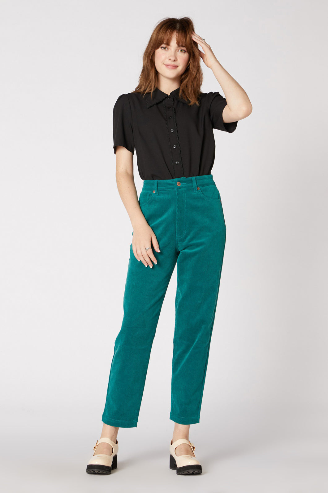 Featuring handy pockets for practicality and antique brass zippers and buttons for a vintage touch, these pants are as functional as they are stylish. Available in vibrant teal and magenta, they bring a pop of color to your wardrobe.