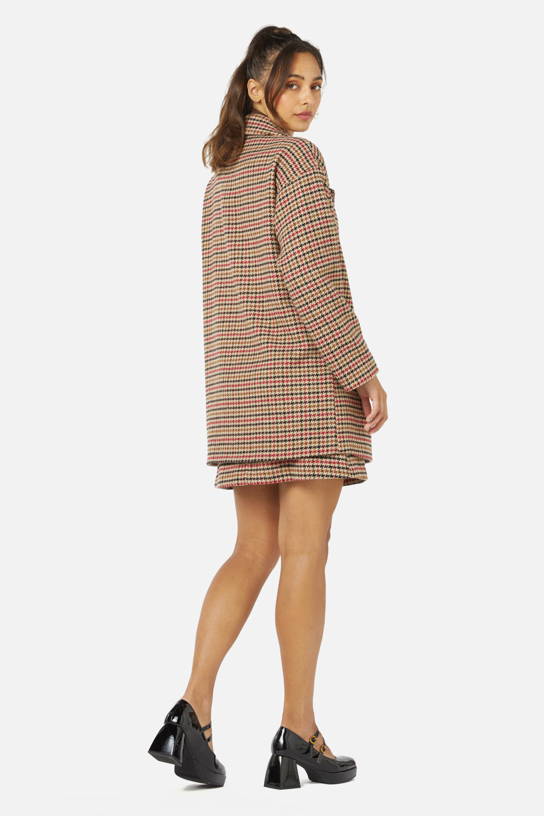 Wrap yourself in cozy sophistication with the Bennett Coat, a stylish neutral check coat designed for a relaxed and oversized fit. Featuring a drop shoulder and wide, boxy silhouette, this coat offers a comfortable yet chic layer for chilly days. The large lapel collar and double-breasted buttons add a classic touch, while the hidden front pockets provide practicality without sacrificing style.
