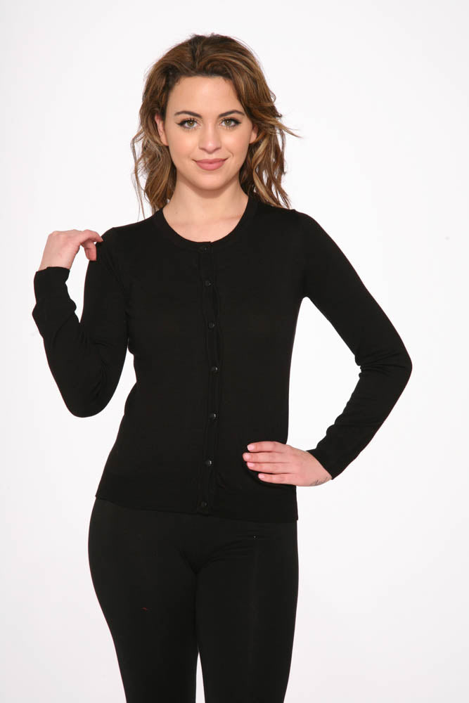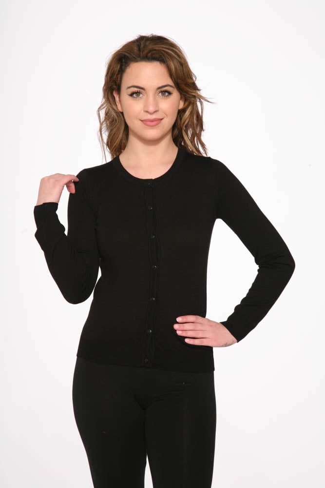 A timeless essential, this sleek black cardigan is the epitome of versatility. With its clean crew neckline, soft stretch knit, and flattering fit, it’s perfect for layering over blouses, dresses, or tees.