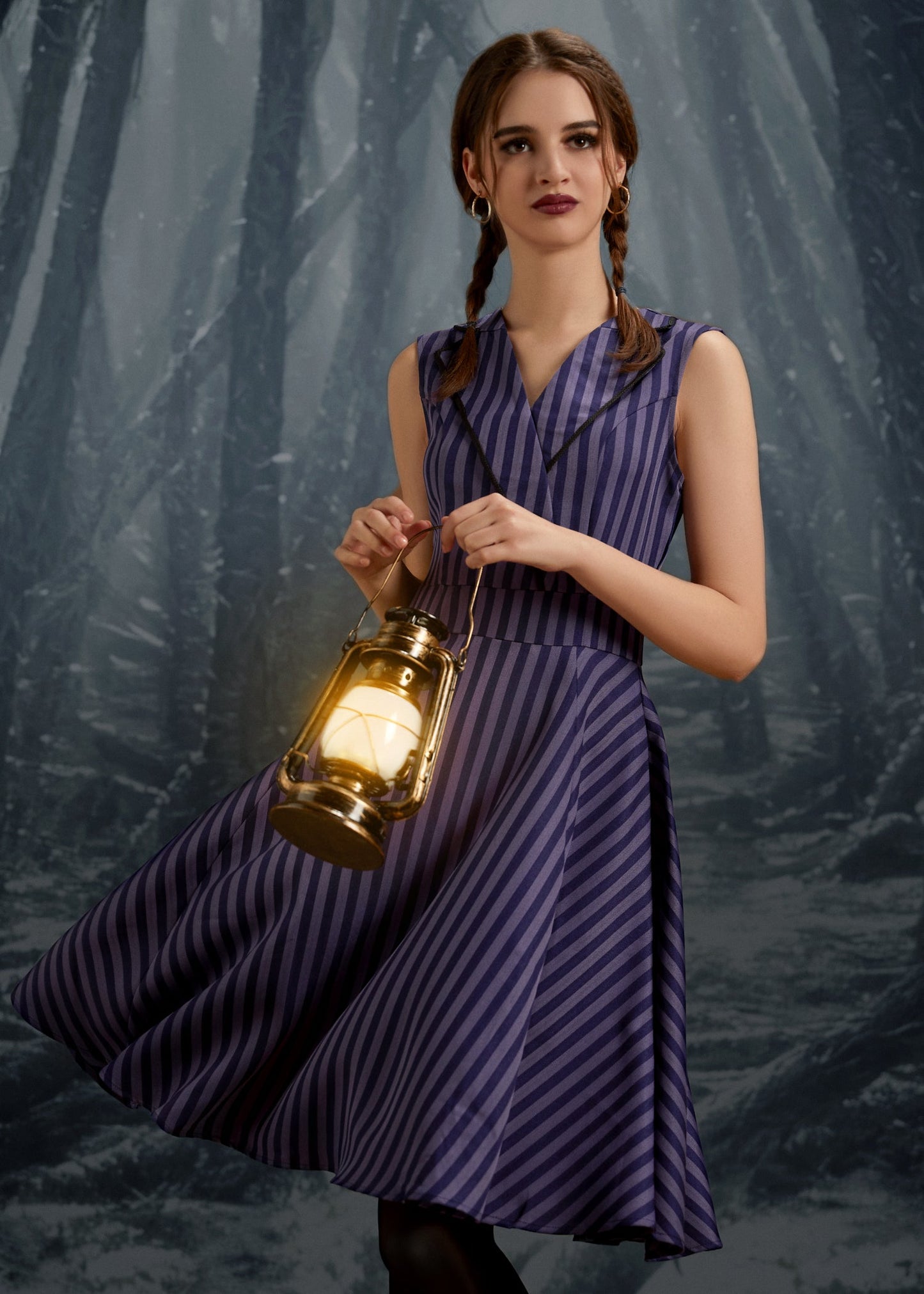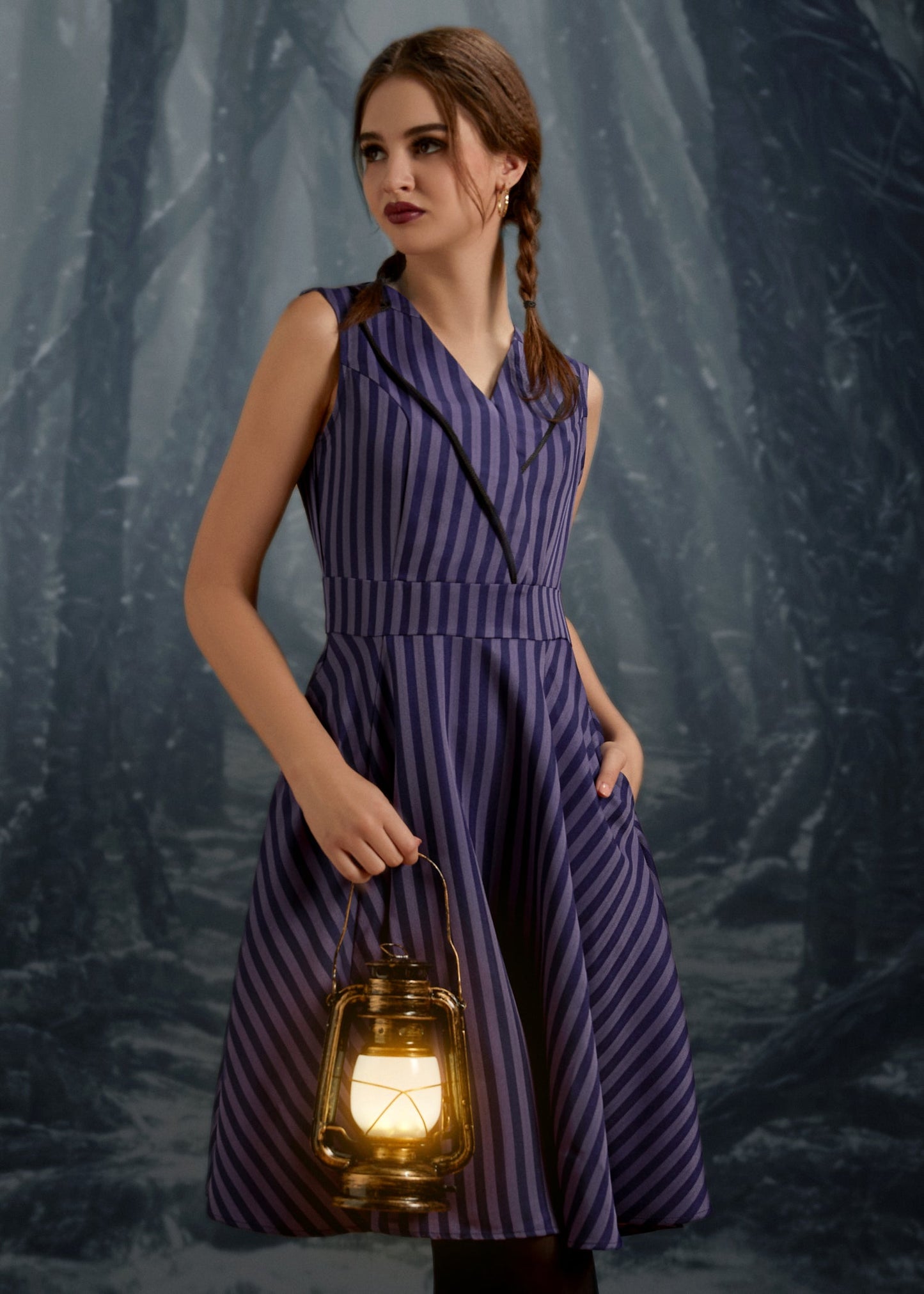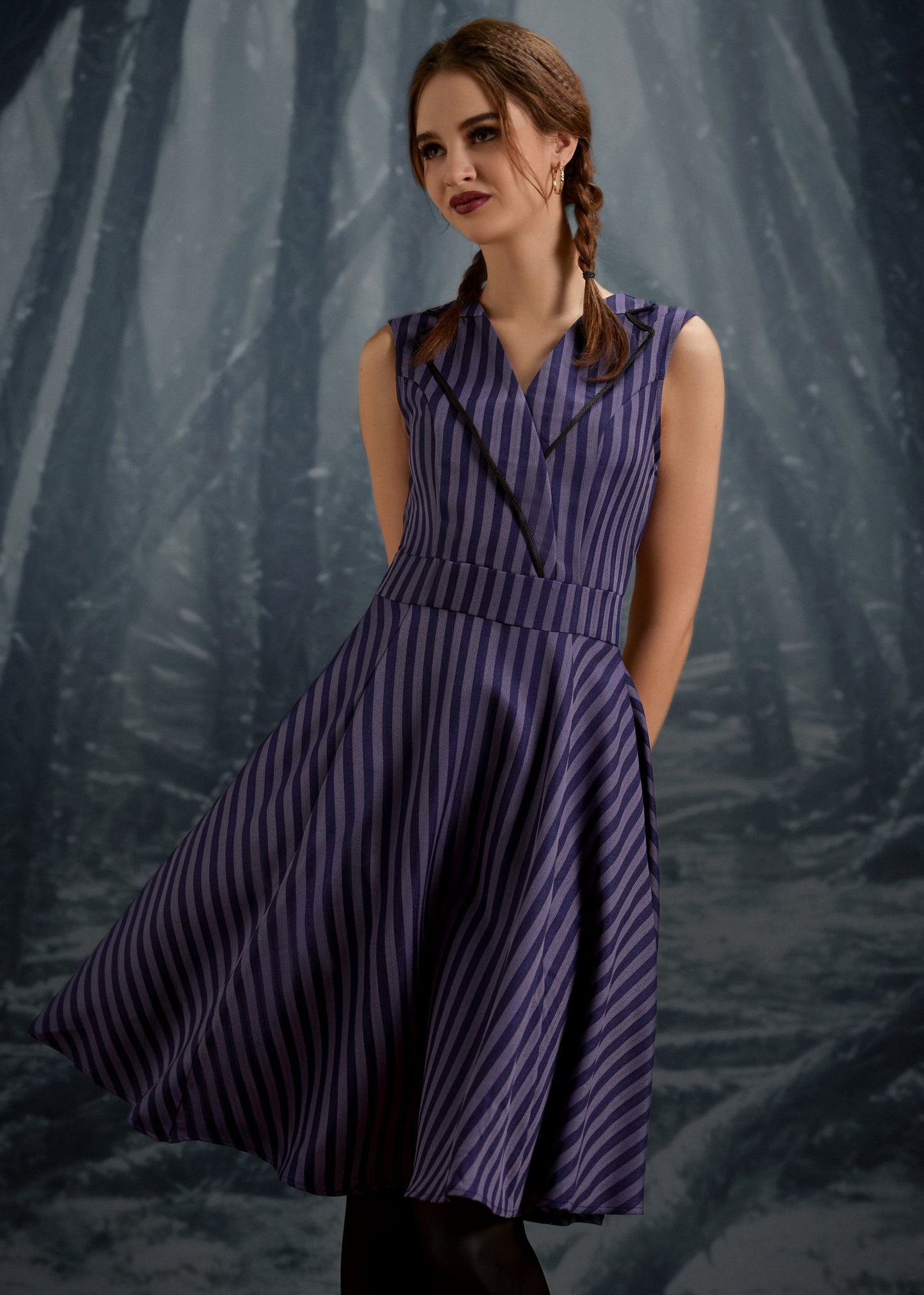 Make a statement in stripes with the Black & Purple Stripe Swing Dress by Orchid Bloom. Featuring a striking combination of black and purple vertical stripes, this vintage-inspired swing silhouette adds a pop of personality to your wardrobe.