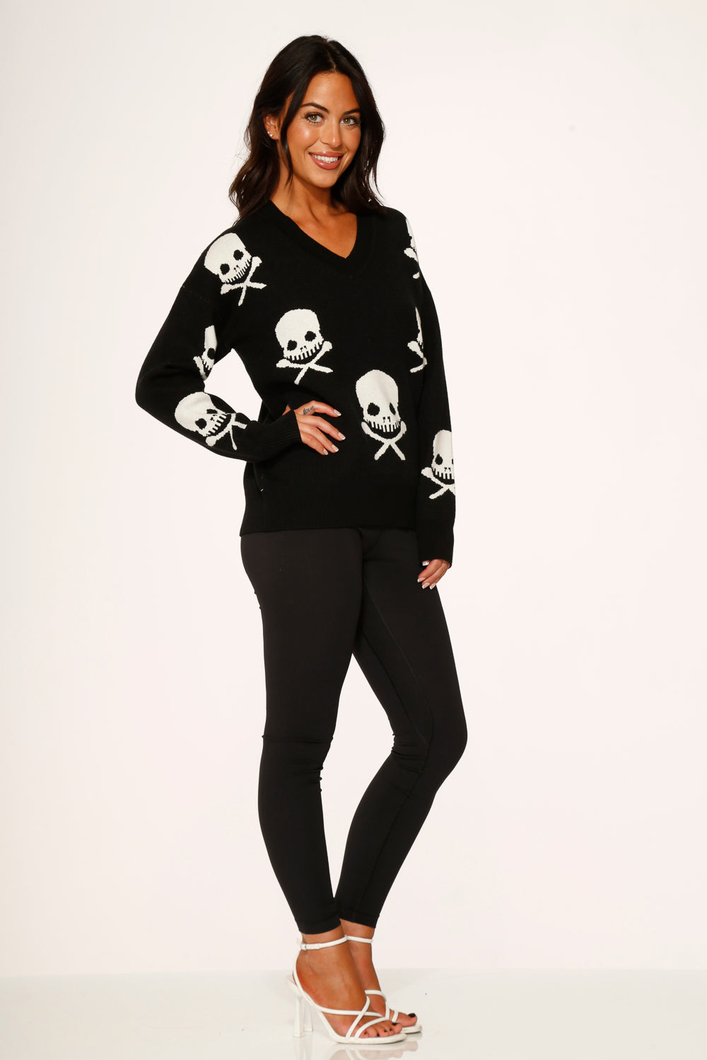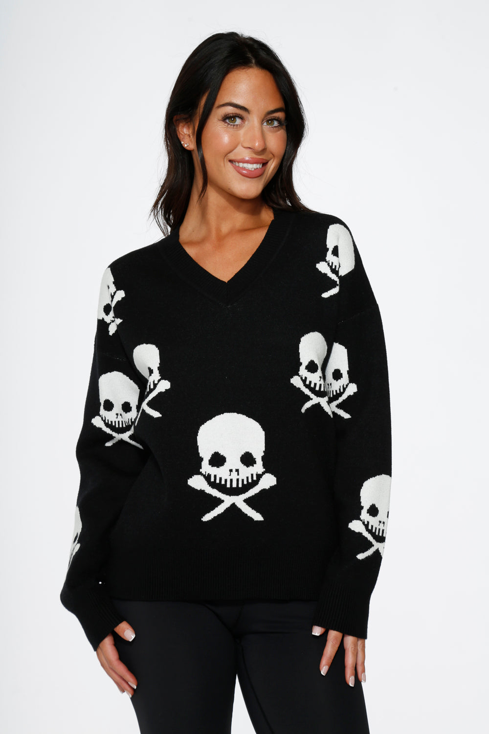 Add a little edge to your cozy with the Orchid Bloom Black Skulls Sweater! Featuring a bold allover skull print and crafted from a soft, stretchy blend, this sweater brings a playful dose of rebel spirit to your everyday look. Perfect for layering over dresses or pairing with your favorite jeans, it’s comfy, cool, and made for standing out.