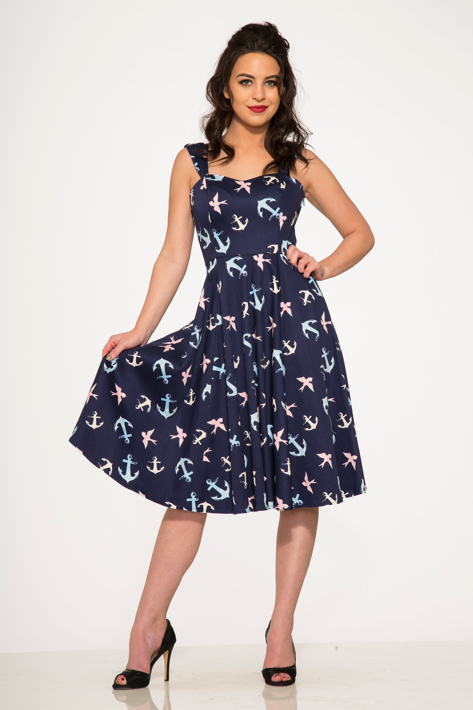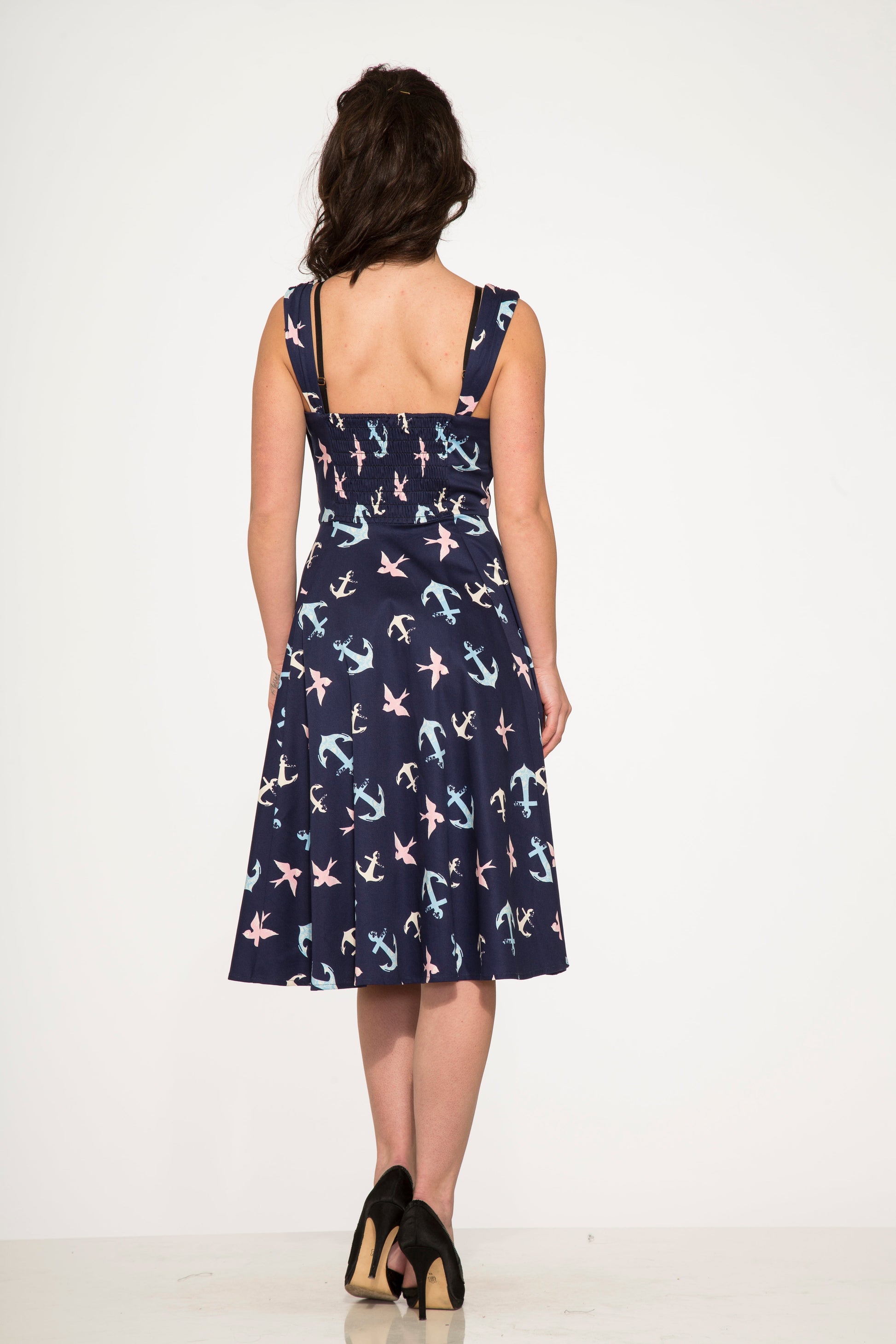 Sail into classic style with the Orchid Bloom Blue Swallows & Anchor Swing Dress! Featuring a nautical-inspired print of swallows and anchors on a vibrant blue backdrop, this vintage-inspired swing dress brings a playful twist to retro chic. Crafted from a soft and stretchy cotton blend, it hugs comfortably while giving you plenty of twirl-worthy movement.