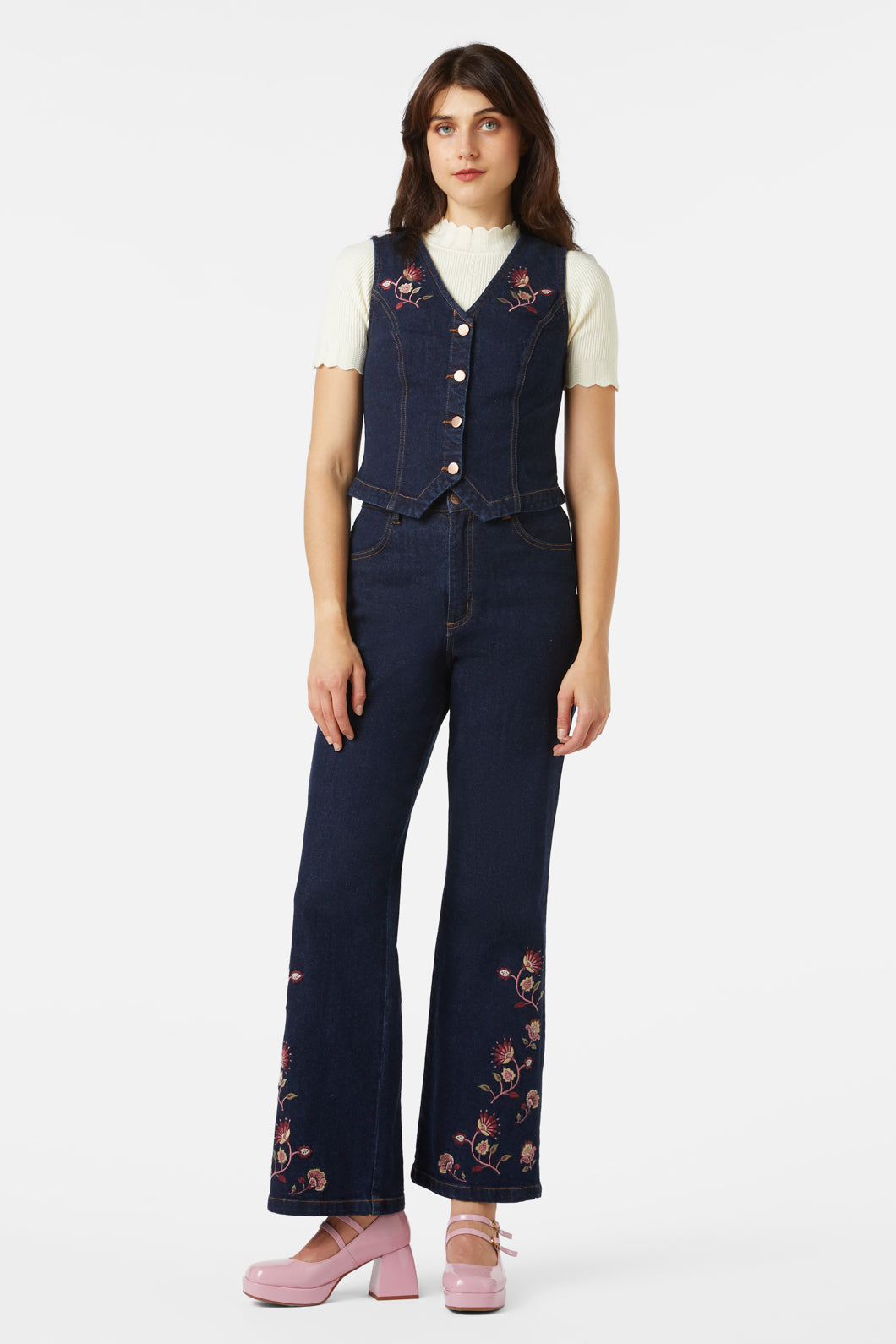 Add a touch of free-spirited flair to your wardrobe with the Boho Paisley Embroidered Vest. This dark denim layer features intricate paisley embroidery for a nod to ‘70s bohemia—perfect on its own or styled with the matching embroidered denim jeans for a full vintage-inspired look.