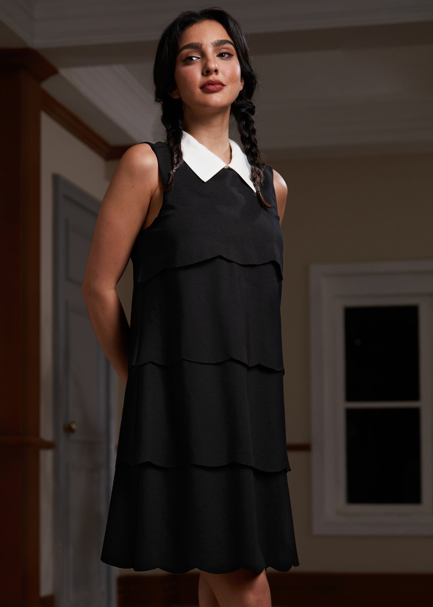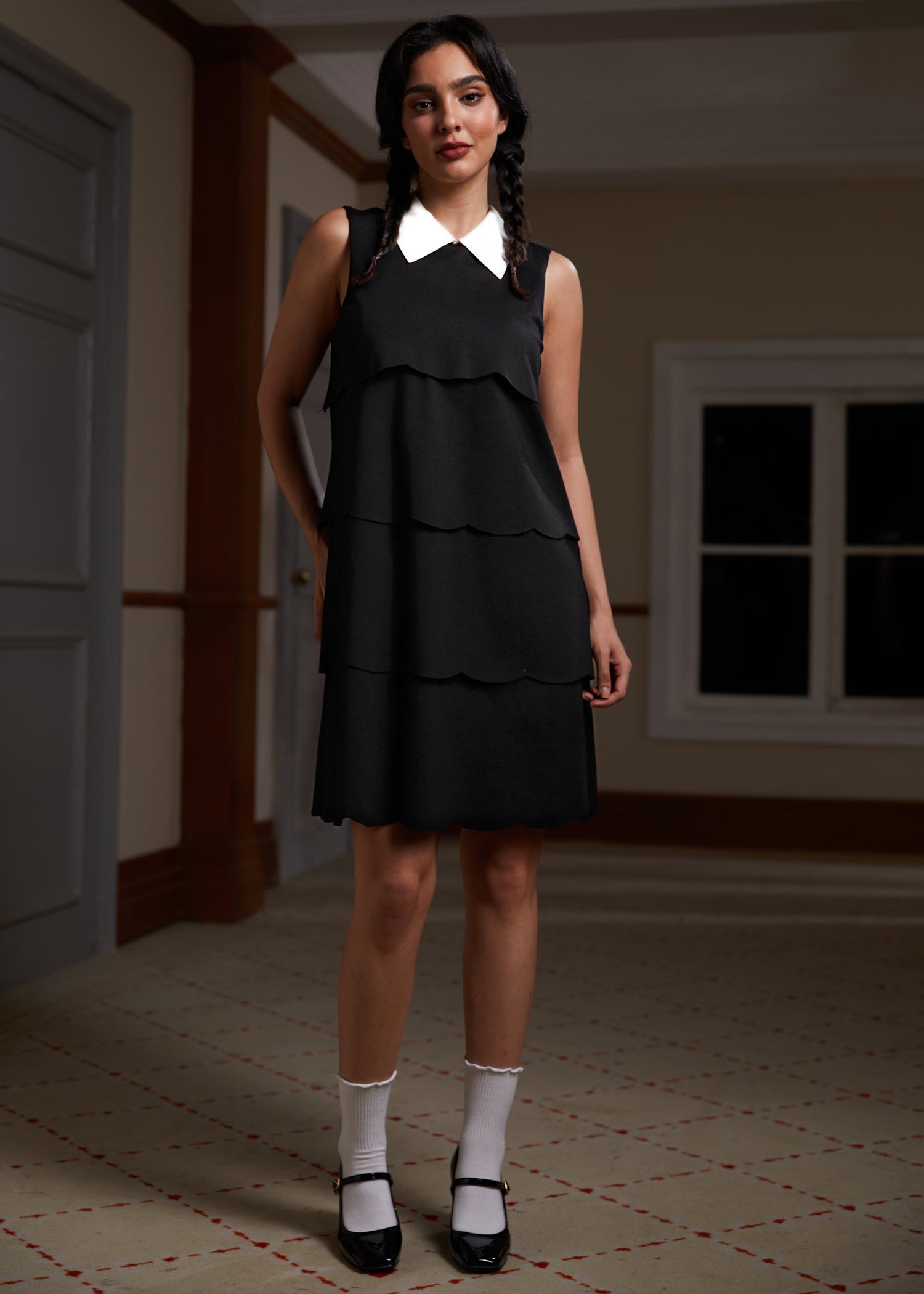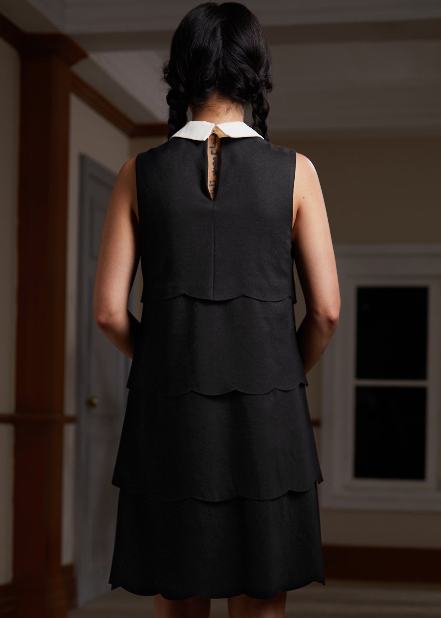 Bonfire Bash A-Line Dress from our ModCloth namesake label offers a nostalgic silhouette with a contemporary twist. Constructed from Ponte fabric with medium stretchability, this black dress cuts a svelte figure while ensuring easy movement. A contrast collar with scallop detail provides a focal point that's as delightful as the first leaf fall, setting the stage for an afternoon of antiquing or a serene date night at your local bistro.