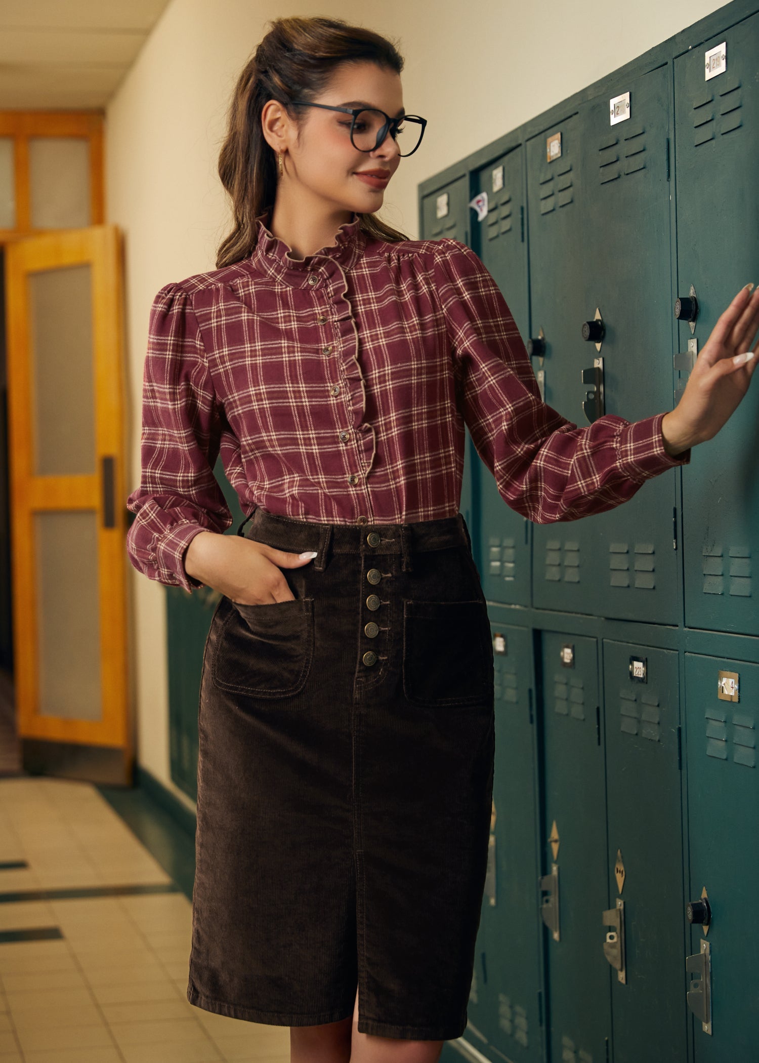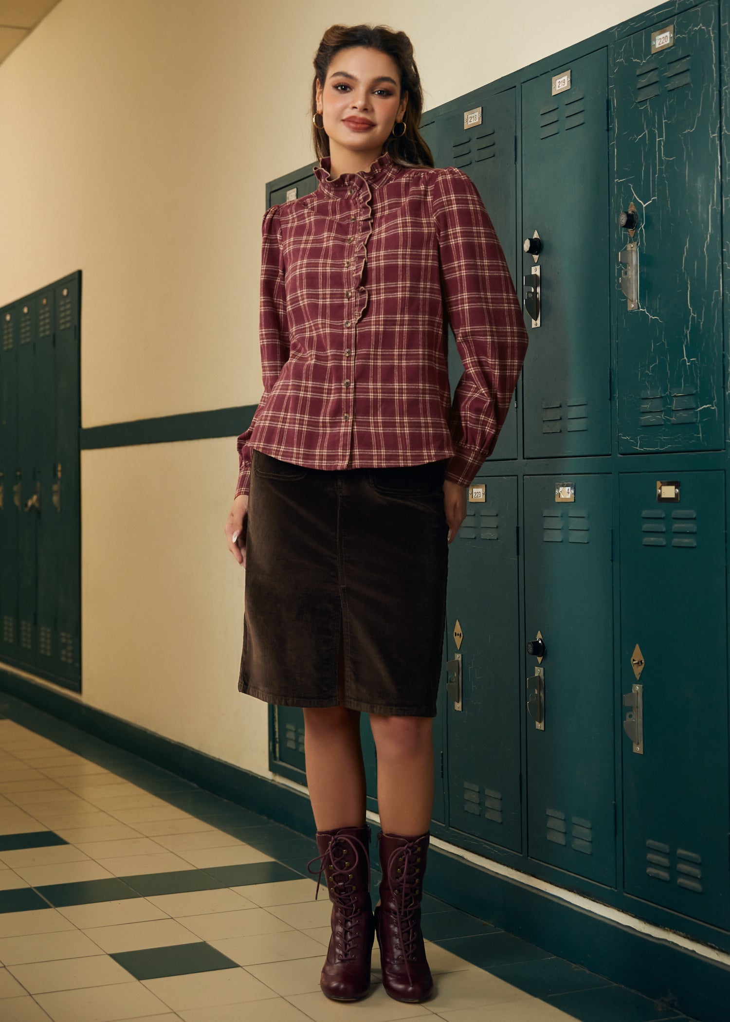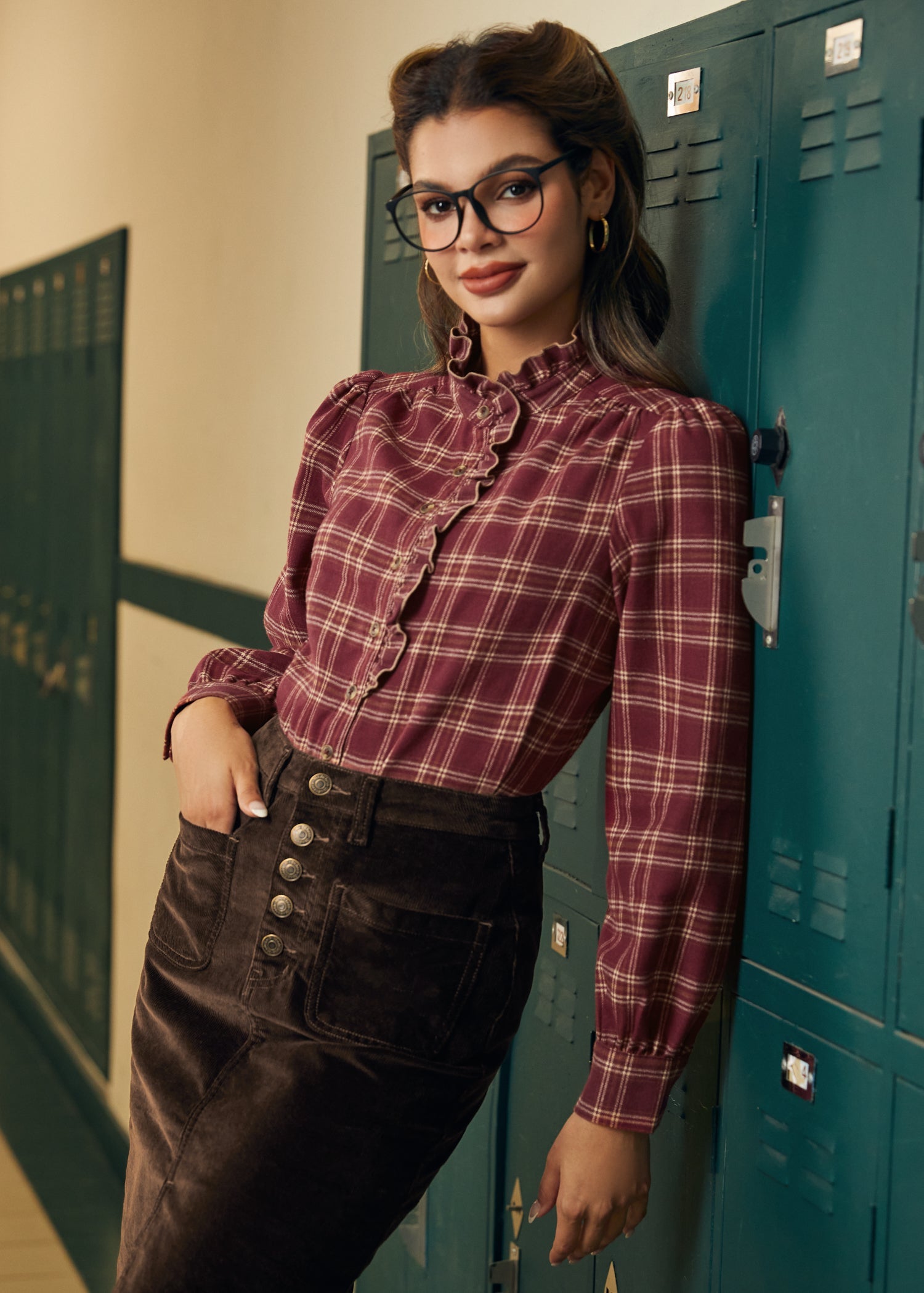 Sweet details meet timeless style in this ruffle placket blouse from our ModCloth namesake label. Made from a soft cotton/polyester blend, this long-sleeve button-front top features a high ruffle neckline and a cascading ruffled placket for a romantic twist. The Mulled Plaid pattern in rich burgundy tones adds cozy vintage charm, making it perfect for pairing with corduroy skirts or denim all season long.