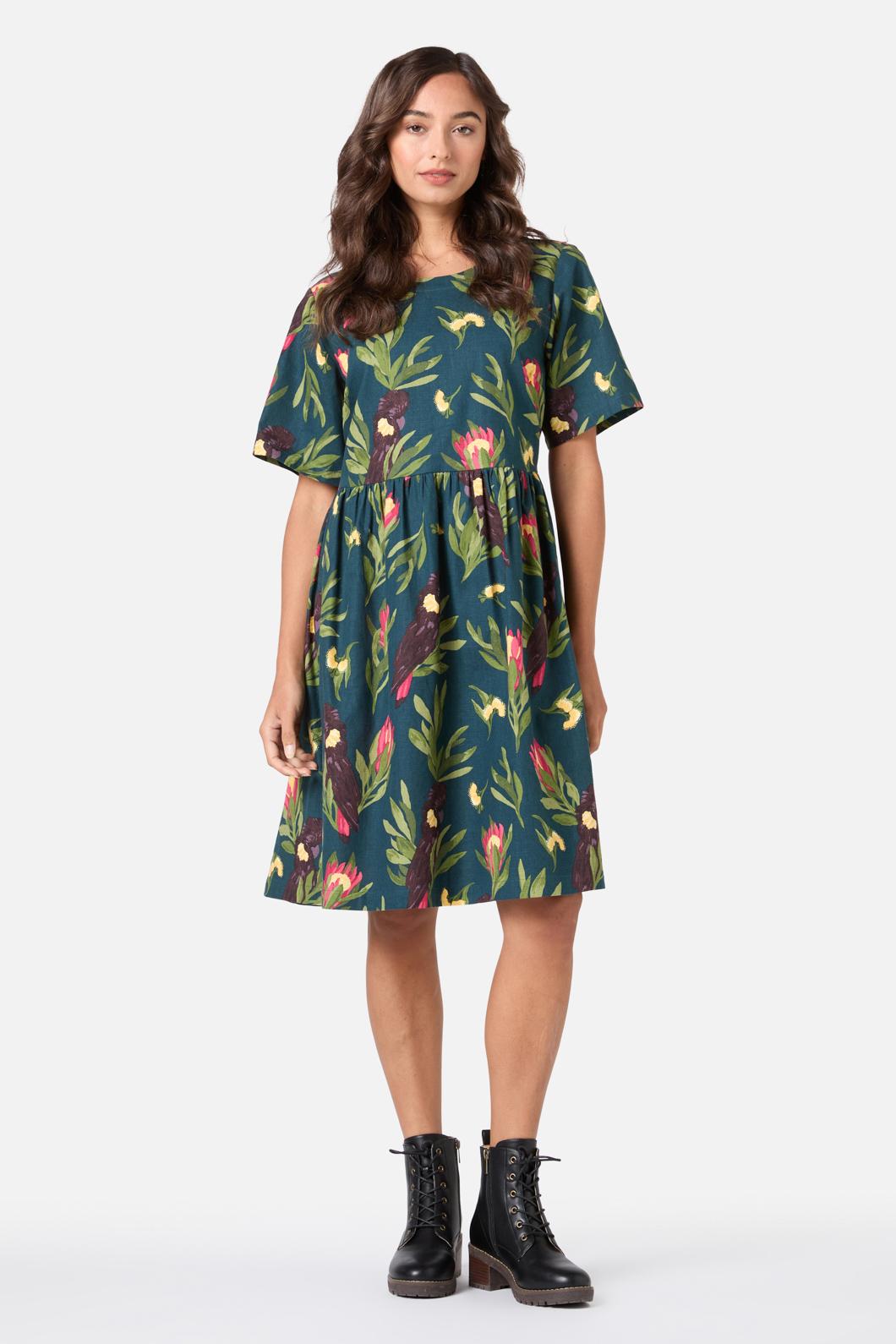 Fly free and bloom bright in the Cockatoo Smock Dress by Princess Highway. Featuring a hand-painted print of red-tailed black cockatoos nestled among vibrant native proteas, this relaxed style is made for days when comfort and creativity take center stage.