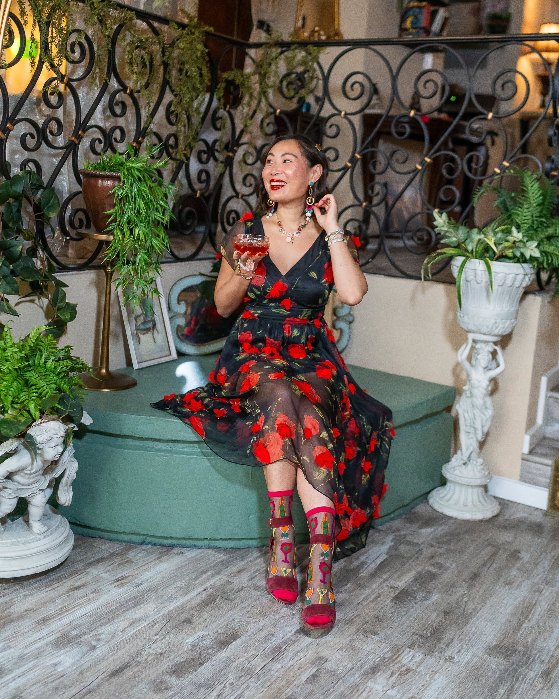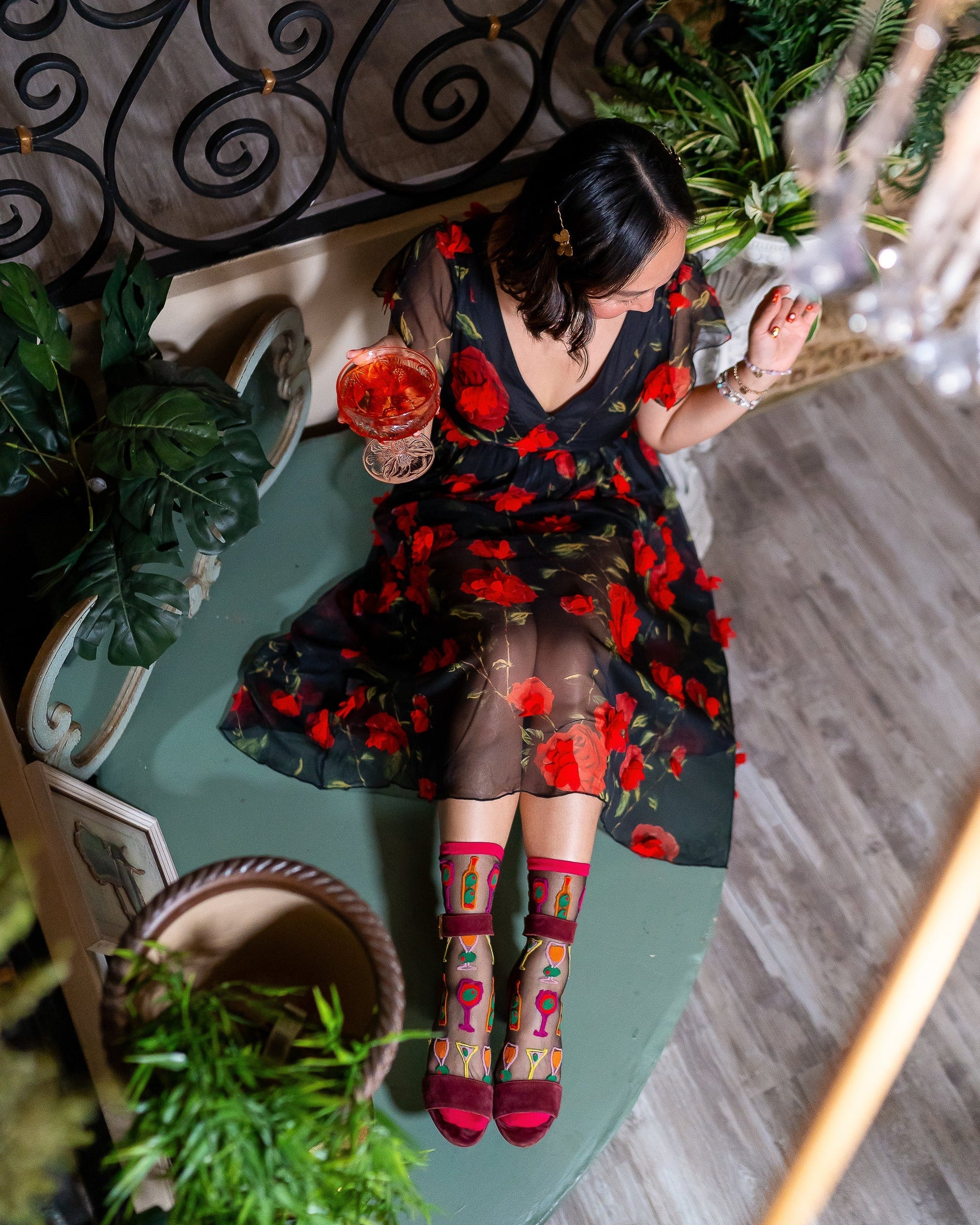 Our Cocktail Hour black sheer sock features wine glasses, martinis, and wine bottles with an unexpected olive twist. The graphic print and electrifying colors give this sock an art museum vibe, perfect for paint and sip nights with the girls. Finished with a mulberry colored cuff, heel, and toe for a sultry look.