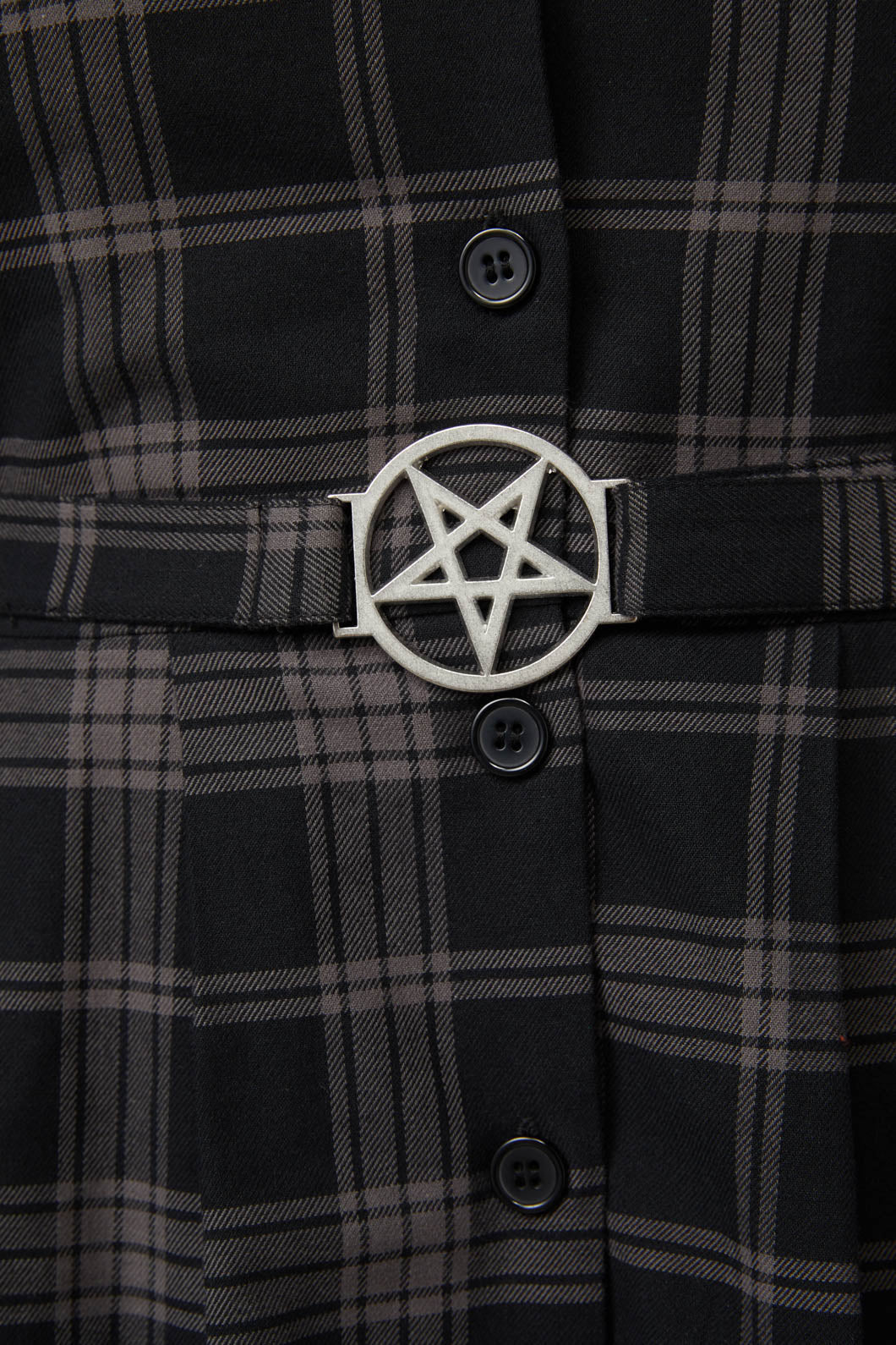 Step into a world where the classic pleat meets contemporary flair with the Dangerfield Tartan Pleated Dress. Crafted from a sumptuous cotton elastane blend, this dress lovingly hugs your figure, then flares out into a playful dance of precise folds. Featuring a distinctive shaped collar that whispers of retro inspiration, this gem comes complete with a unique pentagram buckle belt, lending a dash of whimsy to your waist. Perfect for moonlit soirees or sun-dappled picnics, this captivating black dress is the quintessential companion for those who favor a twist of enchantment in their wardrobe.