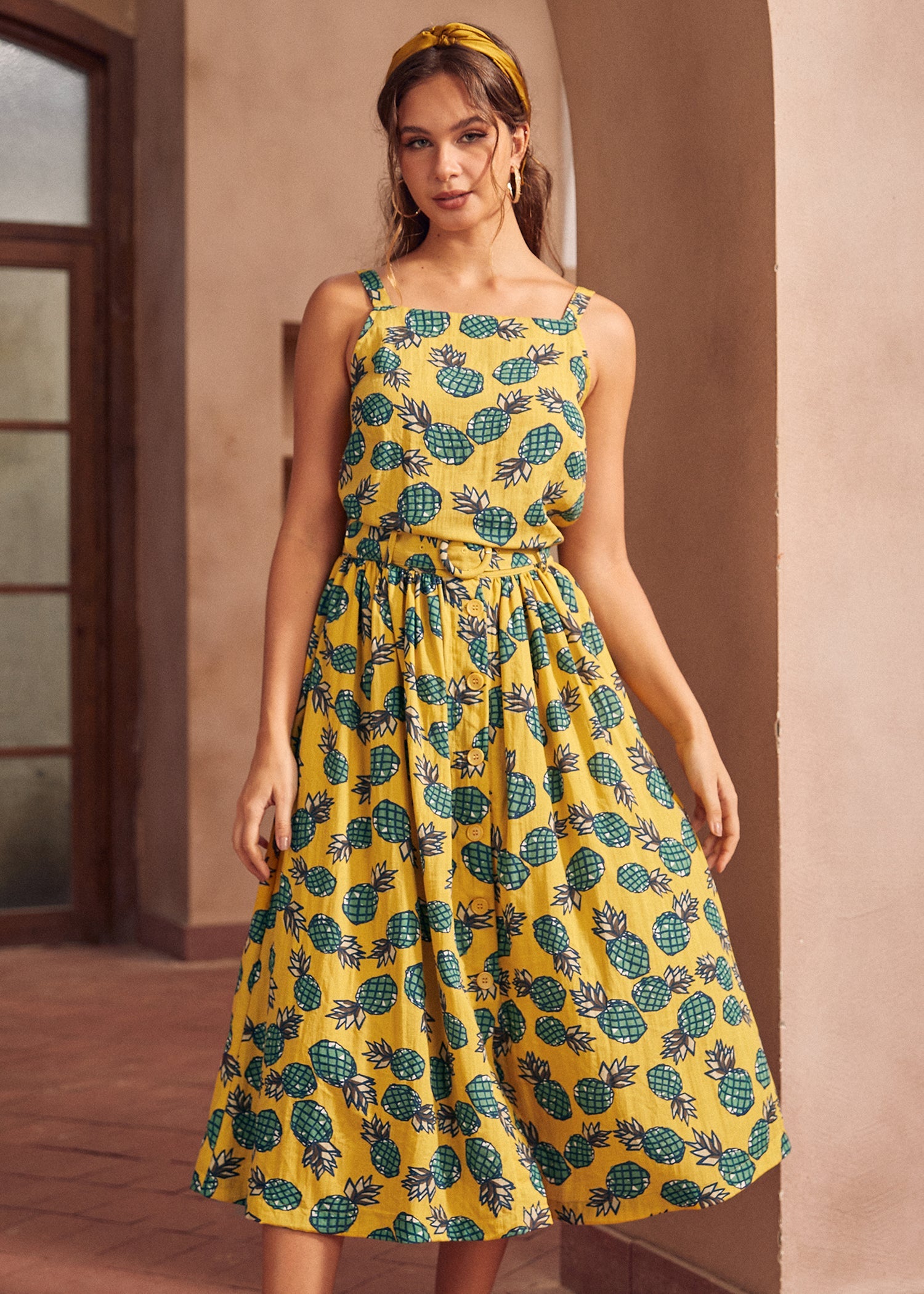 Invite a slice of paradise into your wardrobe with this pineapple-printed midi skirt from our ModCloth namesake label. The high-waisted cut and row of buttons trailing down the front offers a timeless allure that's ripe for afternoon teas or sunny market strolls. Crafted for comfort and flair, its playful print serves as a sweet statement piece that harmonizes effortlessly with a simple tank top and sandals.