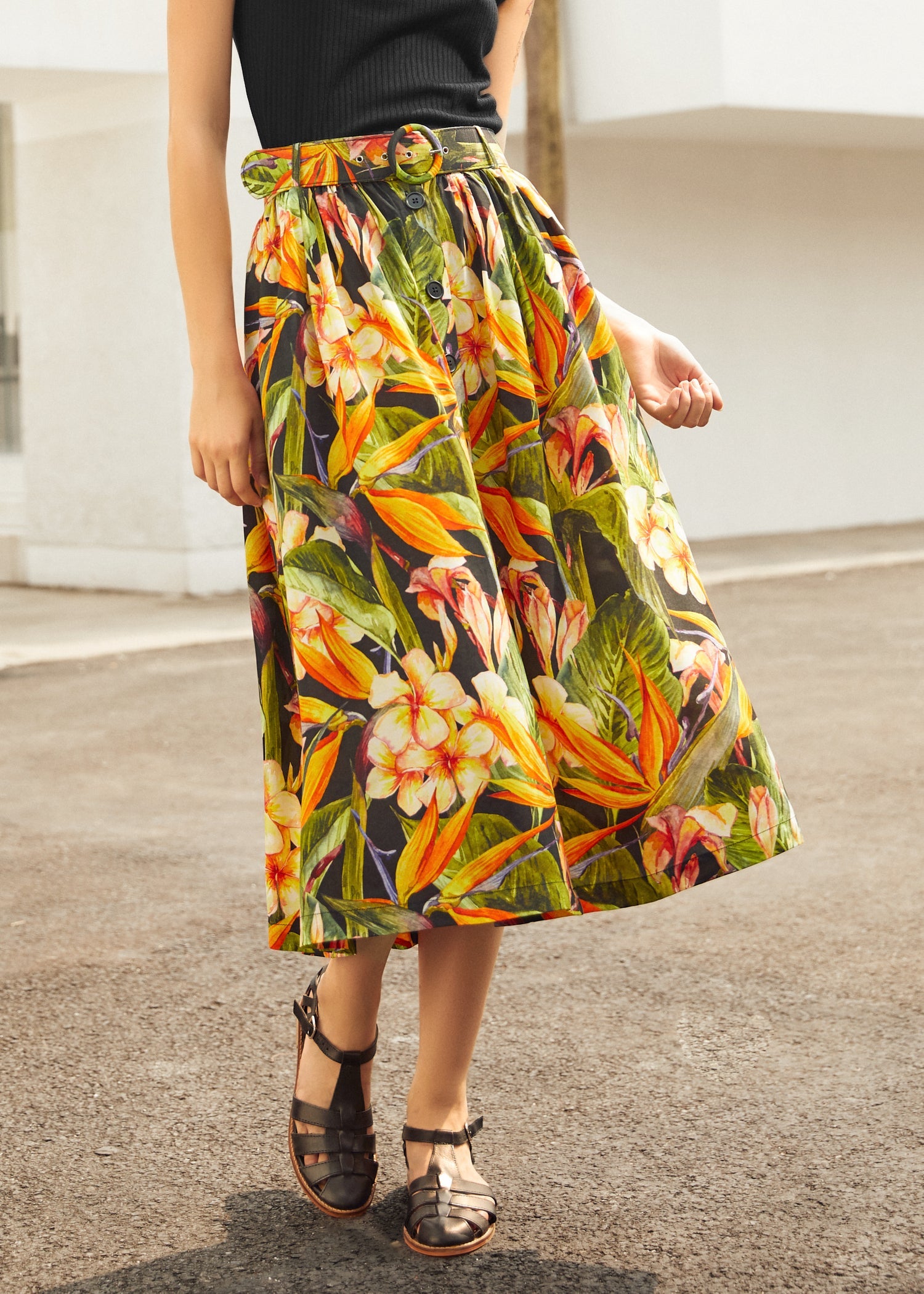 Take a twirl through the tropics in our Daylight Saunter Skirt, a vibrant, mood-lifting midi from our ModCloth namesake label. With its breezy silhouette, bold tropical floral print, and a coordinating belted waist, this skirt was made for golden-hour strolls and market mornings alike.