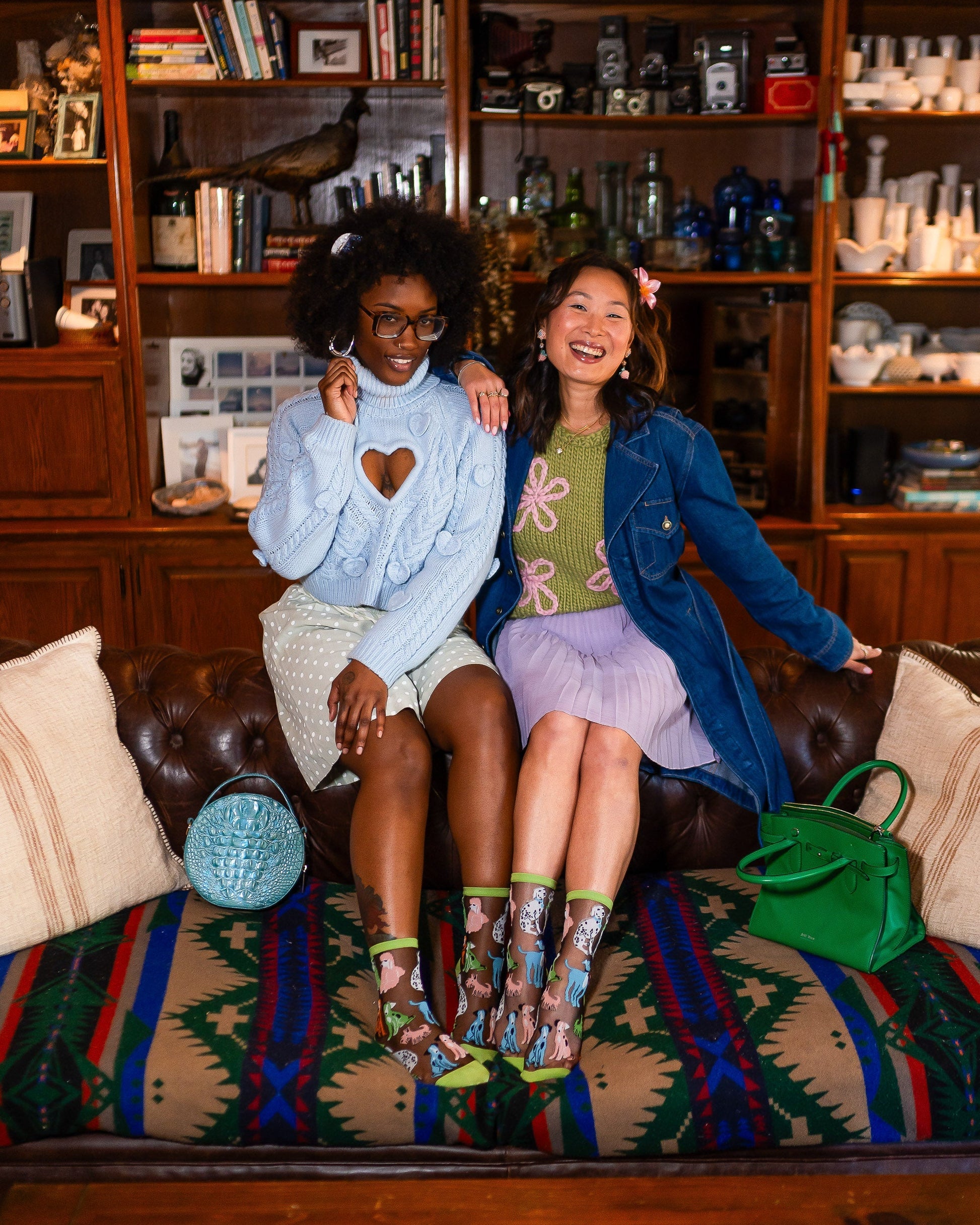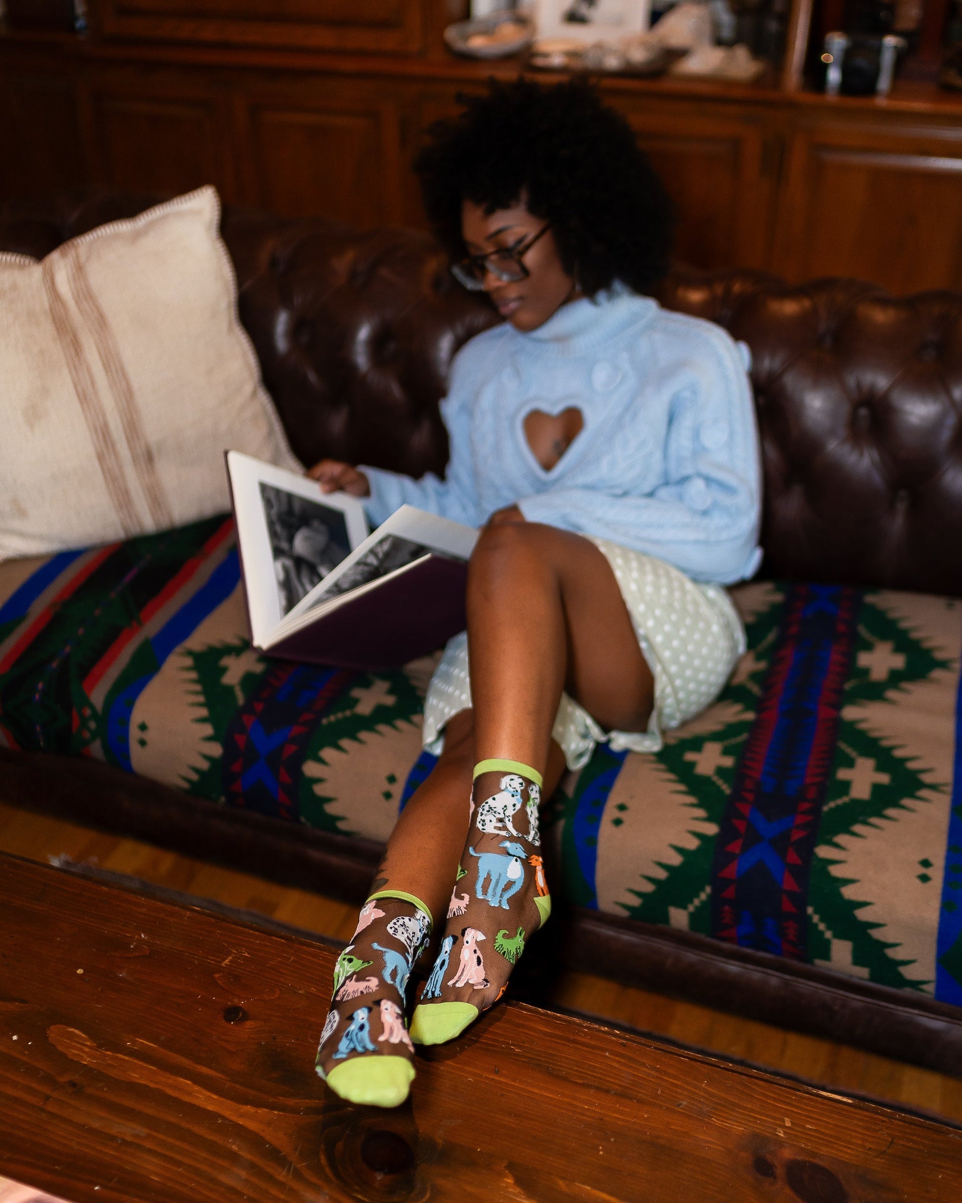Our Dopamine Dogs black sheer sock is your go-to source for a daily dose of happiness. Bursting with personality, colorfully quirky pups in green, orange, pink, and white adorn the sock, making every step more fun. The fresh green cuff, heel, and toe add a playful Spring vibe, while the black sheer fabric keeps your look effortlessly chic.
