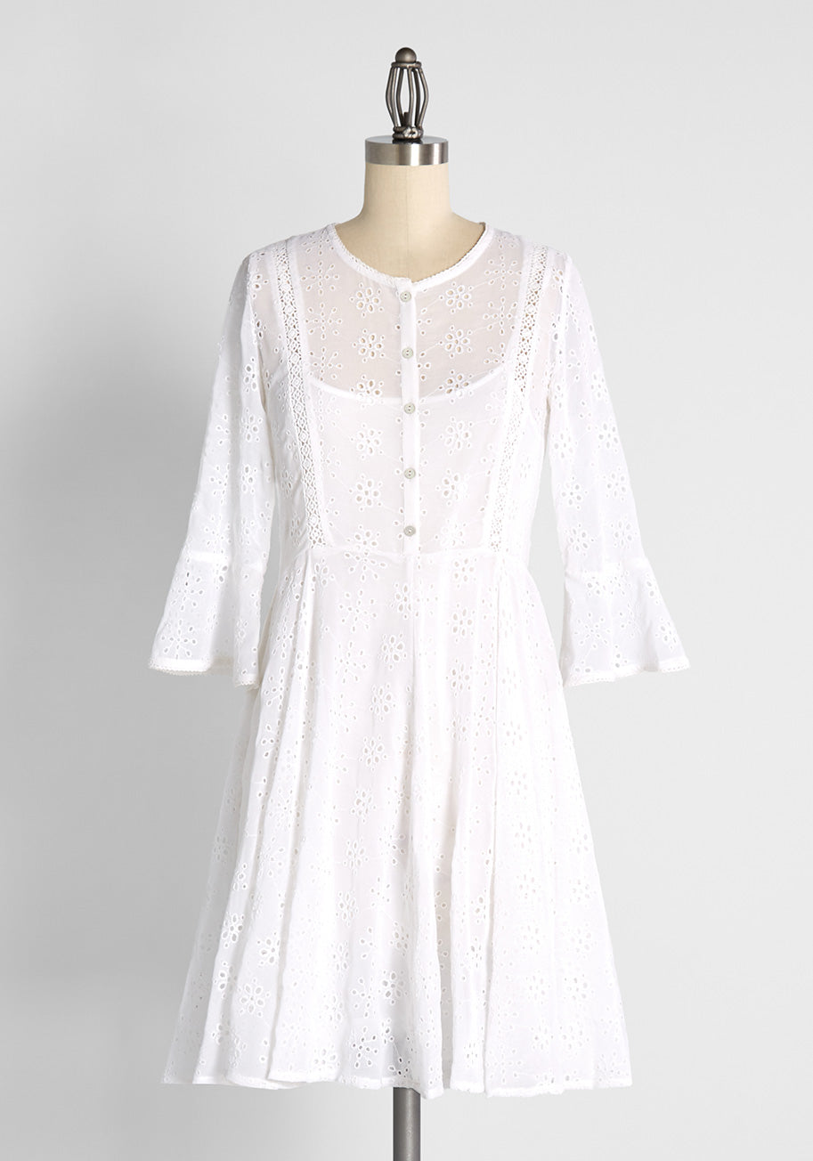 Meadow bound mavens and field searching starlets, turn your compass to this white eyelet mini dress by Amelia Rose to set your aesthetic free. Made of a crisp cool cotton, this mini dress is designed with a slip underneath, a placket of dainty buttons down the bodice, and a light-as-air bell sleeve with a slight flounce. Featuring an eyelet motif pattern all over and crocheted trim, this fresh summer dress is easily styled with neutral espadrilles or sandals.