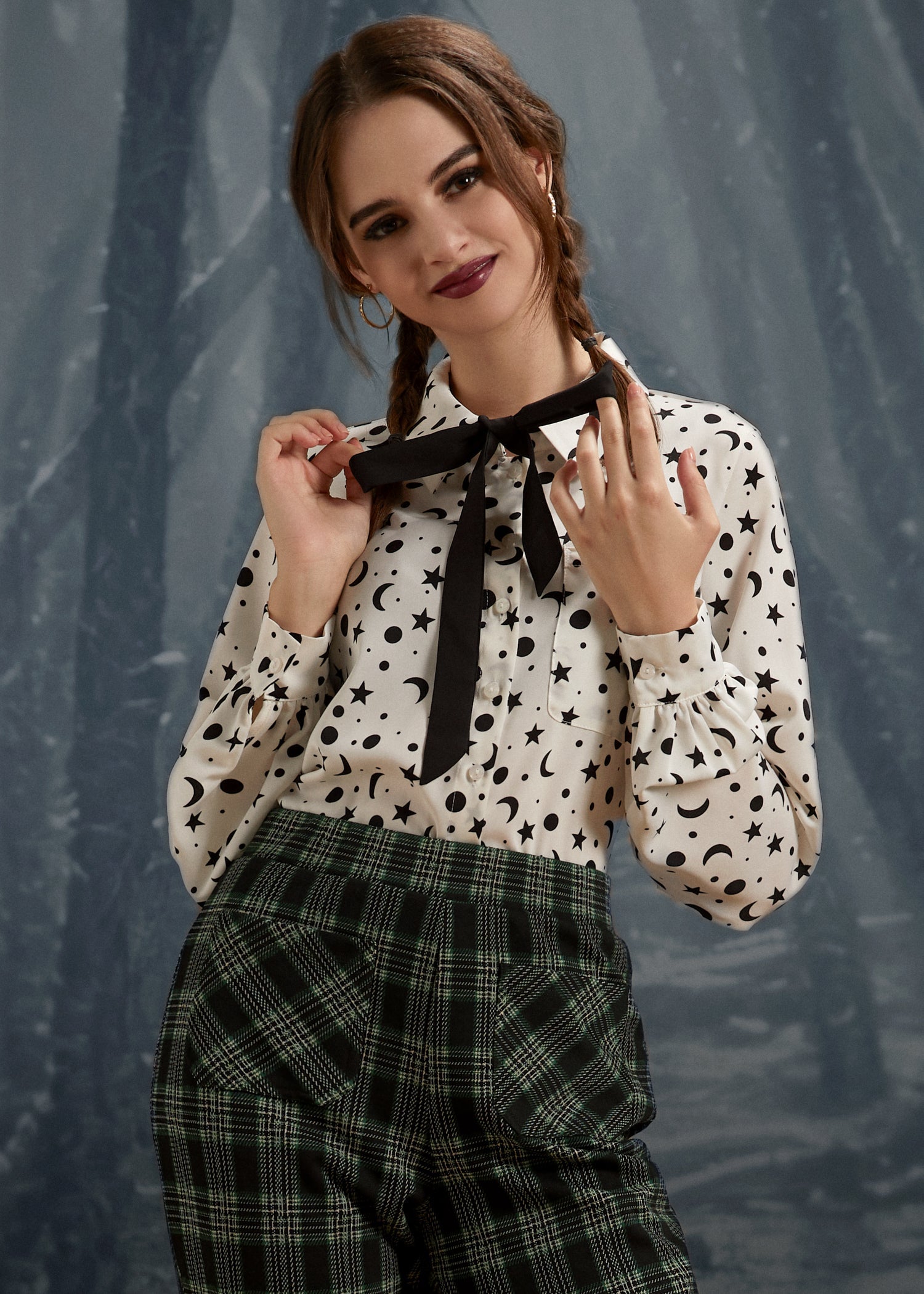 Shoot for the stars (literally) in the Enchanted Evening Collared Blouse from our ModCloth namesake label. This lightweight long-sleeve top features a crisp collar, dramatic tie-neck bow, and softly gathered cuffs. In our Celestial Scribbles print of moons, stars, and constellations, it’s a blouse that brings both polish and playfulness to your wardrobe. Pair it with trousers for office chic or layer it under a pinafore for retro-academic charm.