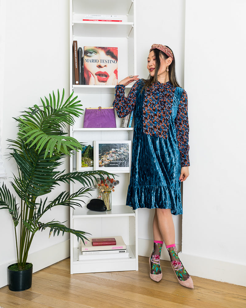 Transition seamlessly from Winter to Spring with romantic pink roses set against black sheer fabric for a charming English garden vibe. The contrasting turquoise heel and leaves add an unexpected pop of color to this black floral sock.