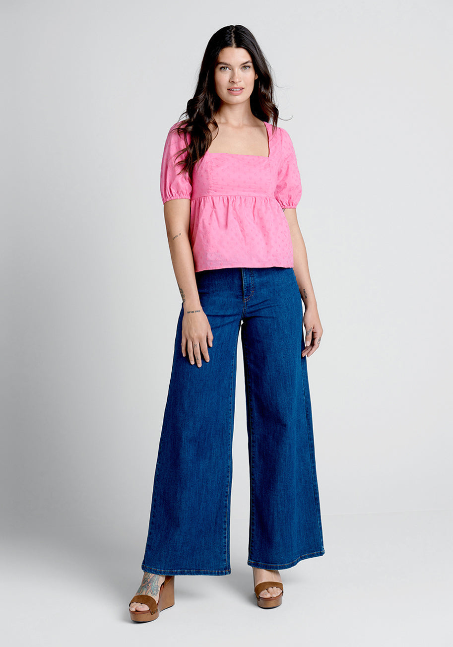 Made from a bright pink-hued cotton dobby weave, this ModCloth namesake label top has the perfect amount of prairie inspiration along with a timeless silhouette to be a favorable addition to your spring wardrobe rotation. Featuring intricately embroidered and ultra-charming Swiss dot daisies all over, this bold babydoll blouse boasts a flattering square neckline, tie-back closure, gathering at the empire waist, and short puff sleeves. A great piece to wear with your favorite high-rise jeans and boho-chic shoes of your choice for an ultimate cottagecore look.