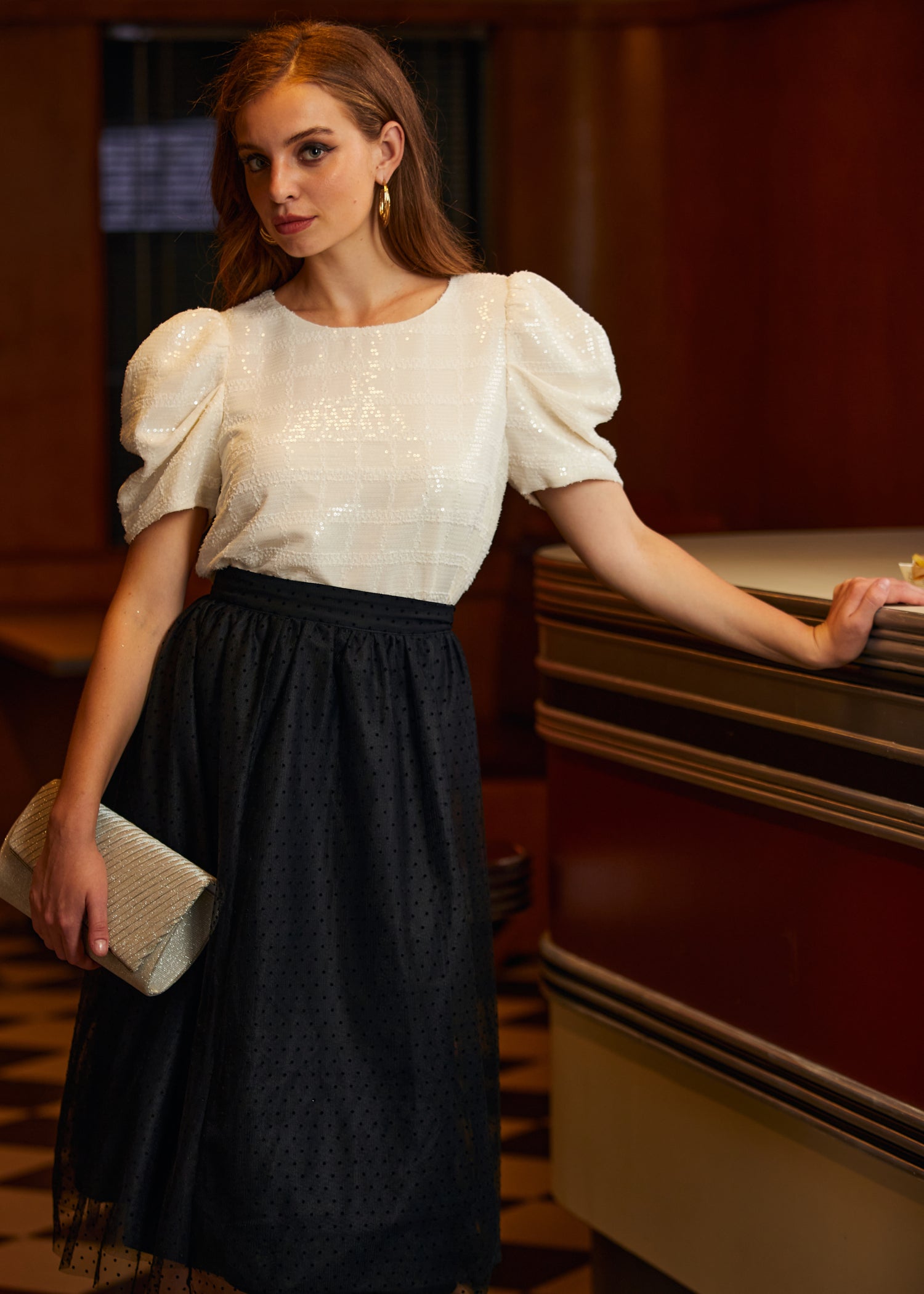 Celebrate the season in style with the Festive Frolic Bubble Sleeve Crew from our ModCloth namesake label. Its bubbly champagne color and bold bubble sleeves are a toast to vintage flair and holiday cheer. This top pairs perfectly with both skirts and trousers, offering a versatile piece that’s equal parts comfy and captivating. Whether you’re hosting a gathering or enjoying quiet moments, it’s a piece that captures the joy of the season.