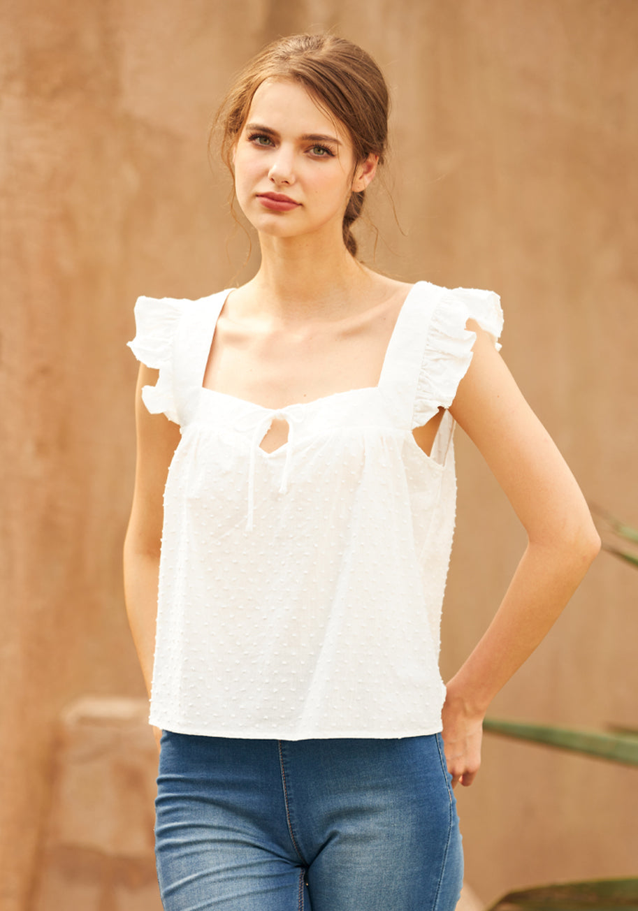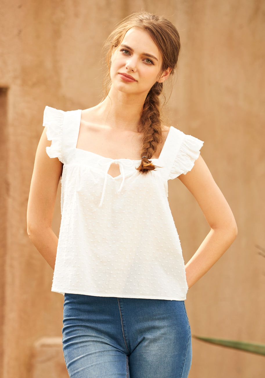 Whisk yourself away to a whimsical wardrobe wonder with this dreamy white blouse from our ModCloth namesake label. The art of frolic meets function in its lightweight, breathable fabric. Dainty ruffle sleeves flutter with every gesture, framing the playful square neckline. Front ties add a carefree touch, cinching effortlessly for a flirty feel. Picture yourself in this airy top at a Sunday picnic or brightening up the office.