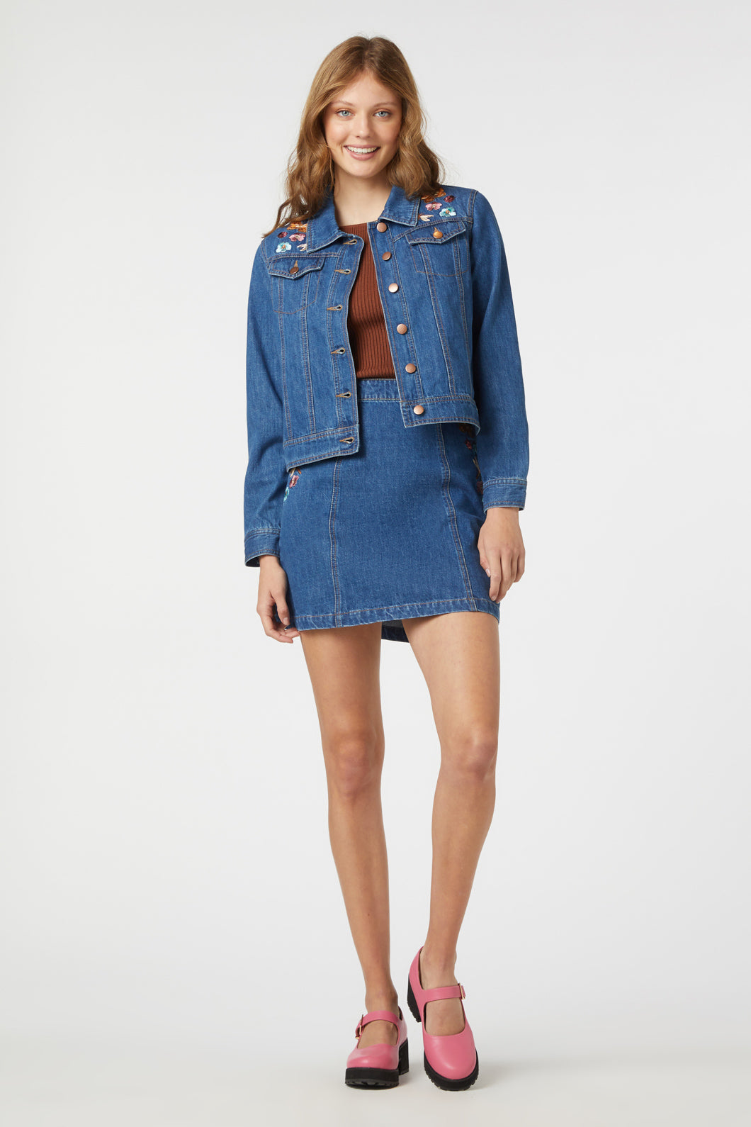 The Flora Embroidered Jacket by Princess Highway is the perfect blend of classic style and playful detail. This everyday denim jacket features charming floral embroidery, adding a touch of whimsy to a timeless silhouette. With long sleeves and a semi-fitted design, it offers both comfort and style.