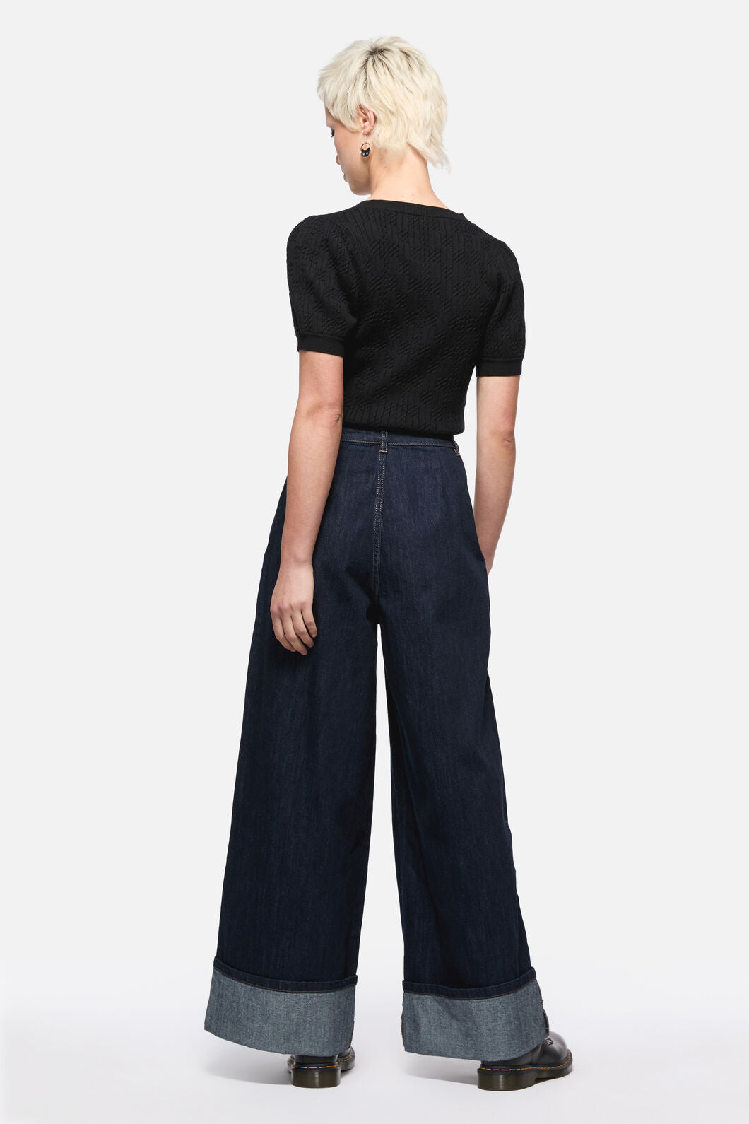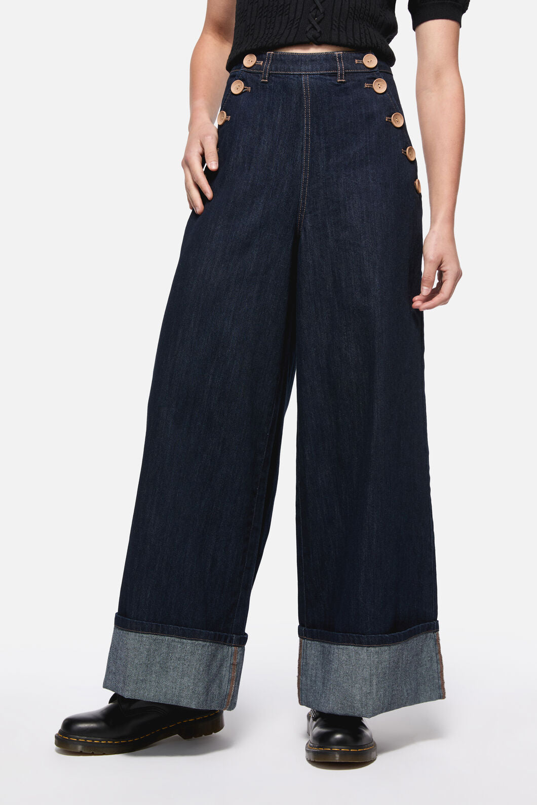 Step into retro perfection with the Forgotten City Jeans by Dangerfield. Inspired by 1970s pinup style, these wide-leg jeans feature a fitted high waist, wooden side buttons, and a statement turn-back cuff at the hem. Whether you're headed to a picnic brunch or just feeling groovy, these kitsch and funky jeans bring bold vintage flair to any outfit.