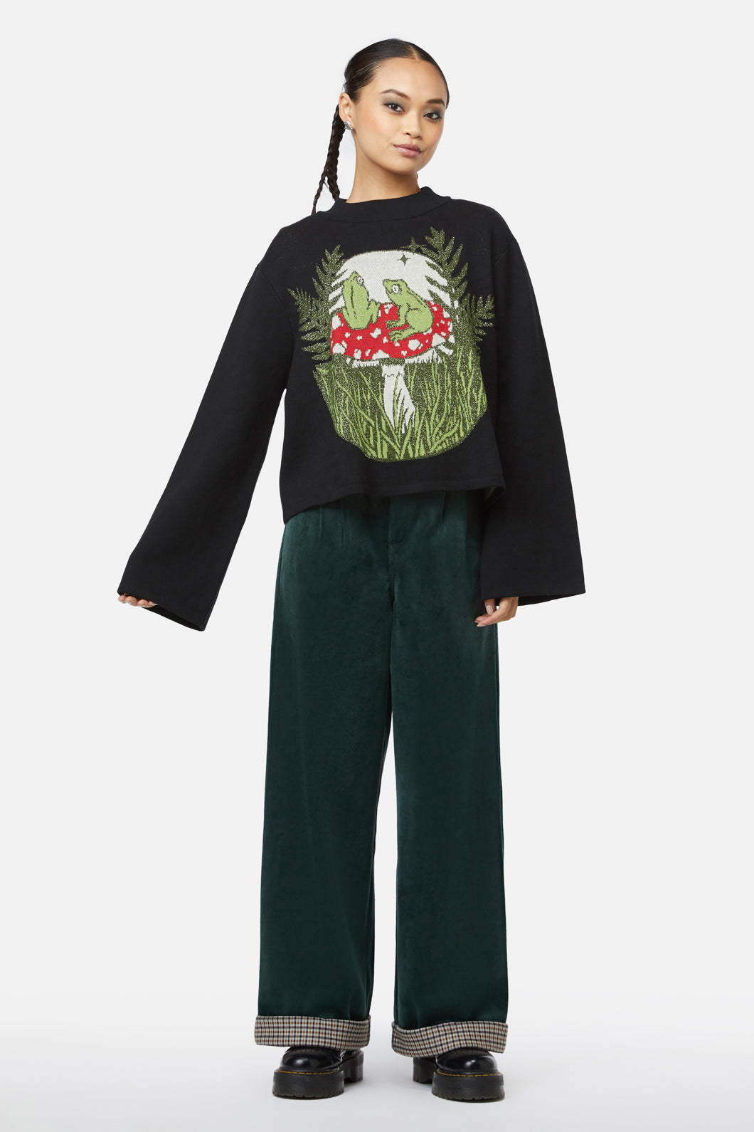 Hop into cozy charm with the Frog Friends Knit Cardigan by Black Friday! This delightfully playful intarsia knit design features a group of whimsical frog friends, brought to life with a glittery effect that adds a little extra sparkle to your day. The mock neck cut and wide-hem sleeves give this piece a vintage-meets-modern twist, perfect for layering over your favorite outfits.