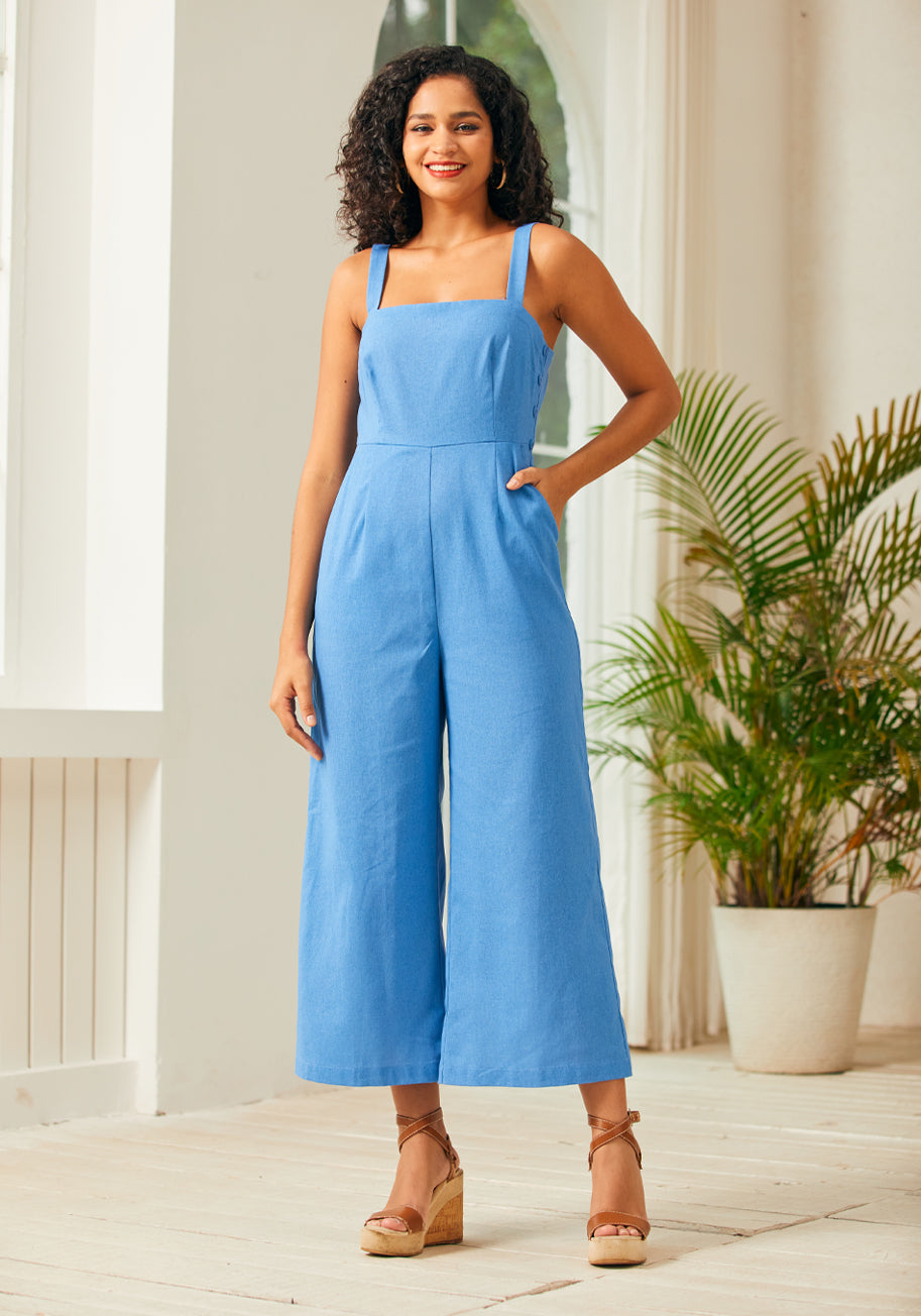 Embrace a splash of delightful retro vibe with this denim blue jumpsuit, a standout piece from our ModCloth namesake label. Its sleeveless top meets dramatically flared bottoms, creating a silhouette that echoes tales of groove and liberation. Made for those who walk the beat of their own drum, this ensemble pairs seamlessly with sunny afternoons spent exploring hidden bookshops or nights grooving to vinyl records under the glow of string lights.