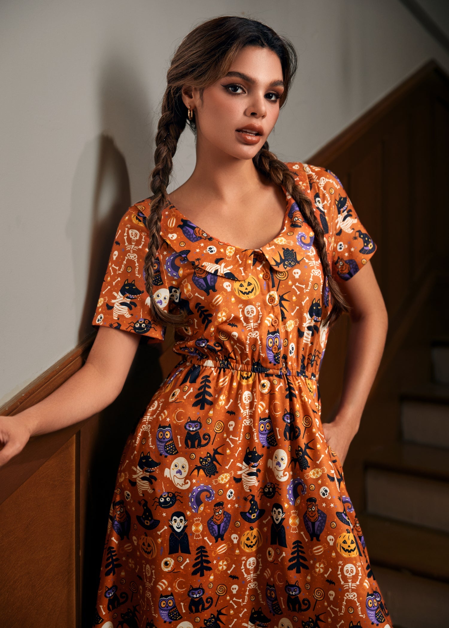 Step into spooky-chic style with the Ghouls Just Wanna Have Fun Dress from our ModCloth namesake label. This short-sleeve fit-and-flare features a scoop neckline with a rounded collar, a button-front placket, and an elastic waist for all-day comfort. Complete with pockets, it’s finished in the Sweet Shiver print — a quirky mix of owls, black cats, skeletons, candy, and pumpkins — making it a frightfully fun pick for Halloween and beyond.