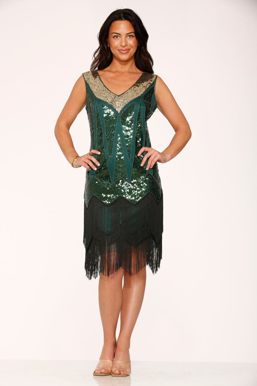 Light up the dance floor in this radiant emerald green flapper dress by Orchid Bloom. Featuring shimmering sequins, a gold-accented neckline, and layered fringe for playful movement, this vintage-inspired piece brings Gatsby glam to any celebration.