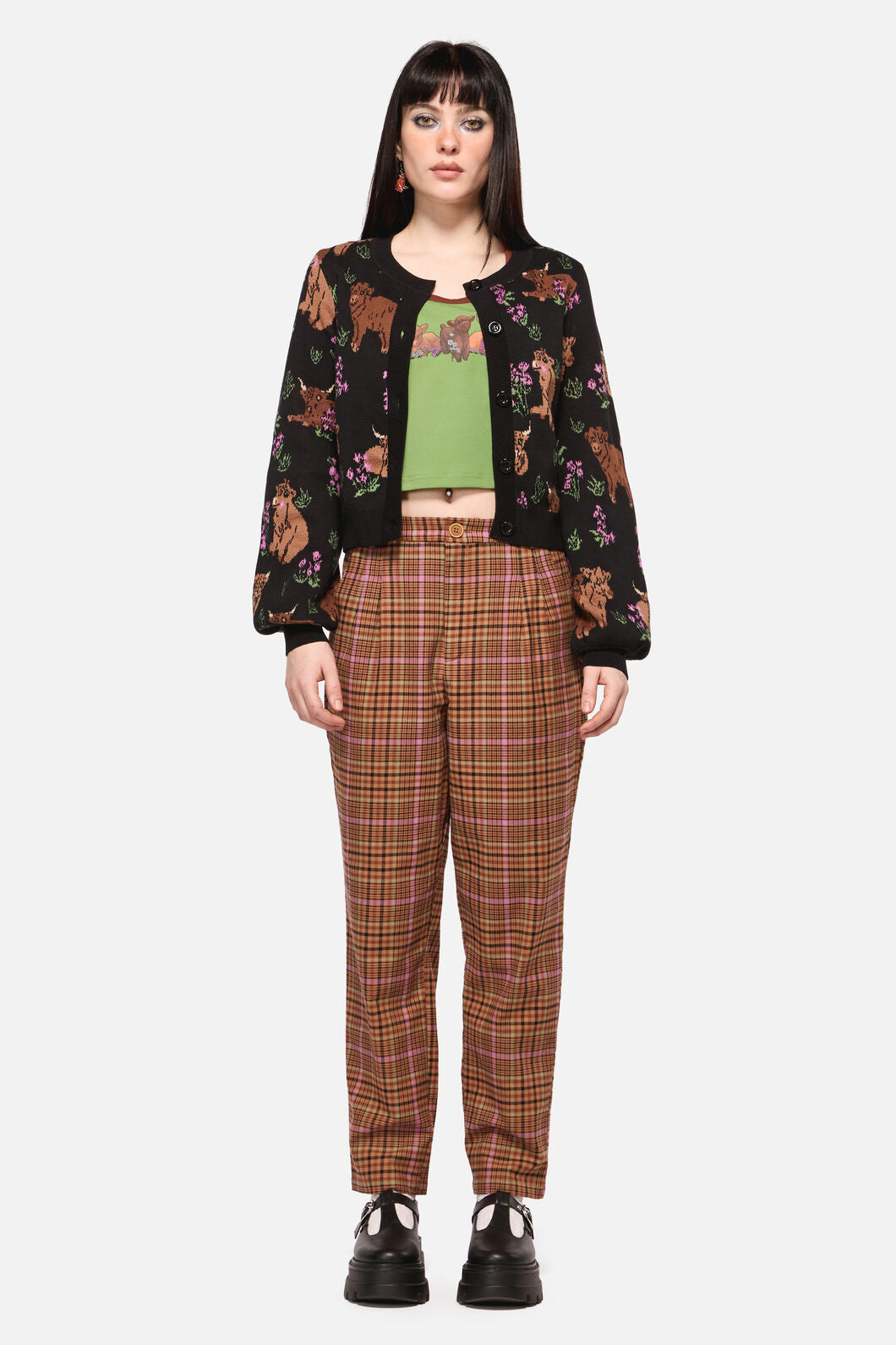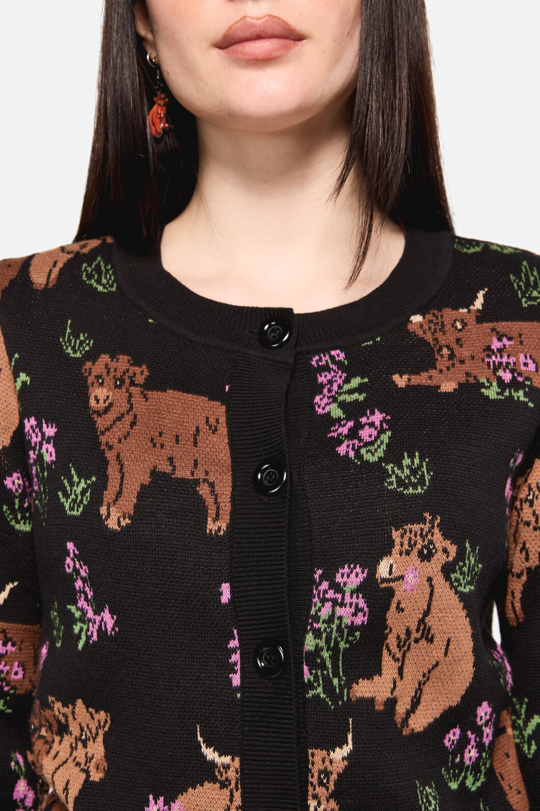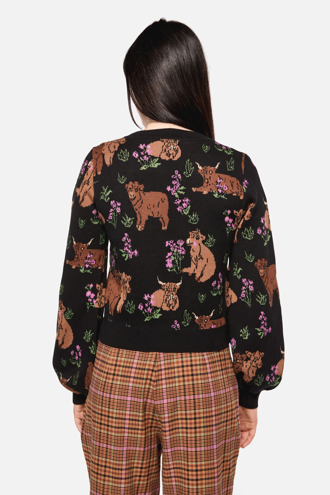 Majestic. Stoic. Moo-vingly cozy. Channel your inner bovine with this whimsical Highland cow-inspired cardigan. With its snuggly knit and playful pastoral vibes, this cardi is perfect for those who long to roam the hills—or just curl up indoors with a cuppa.