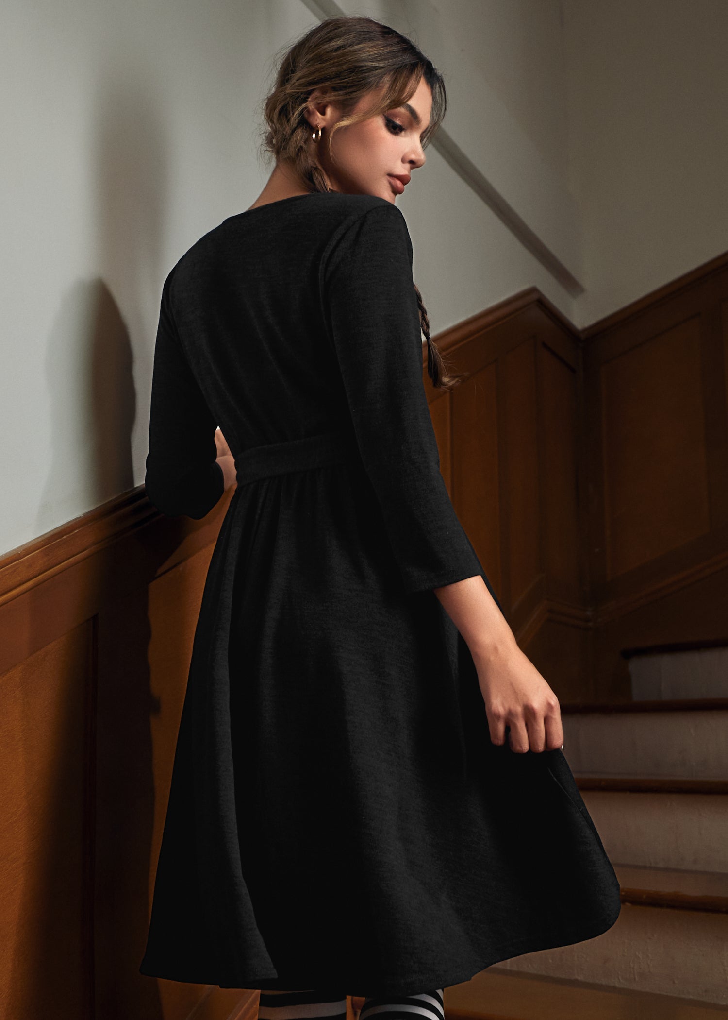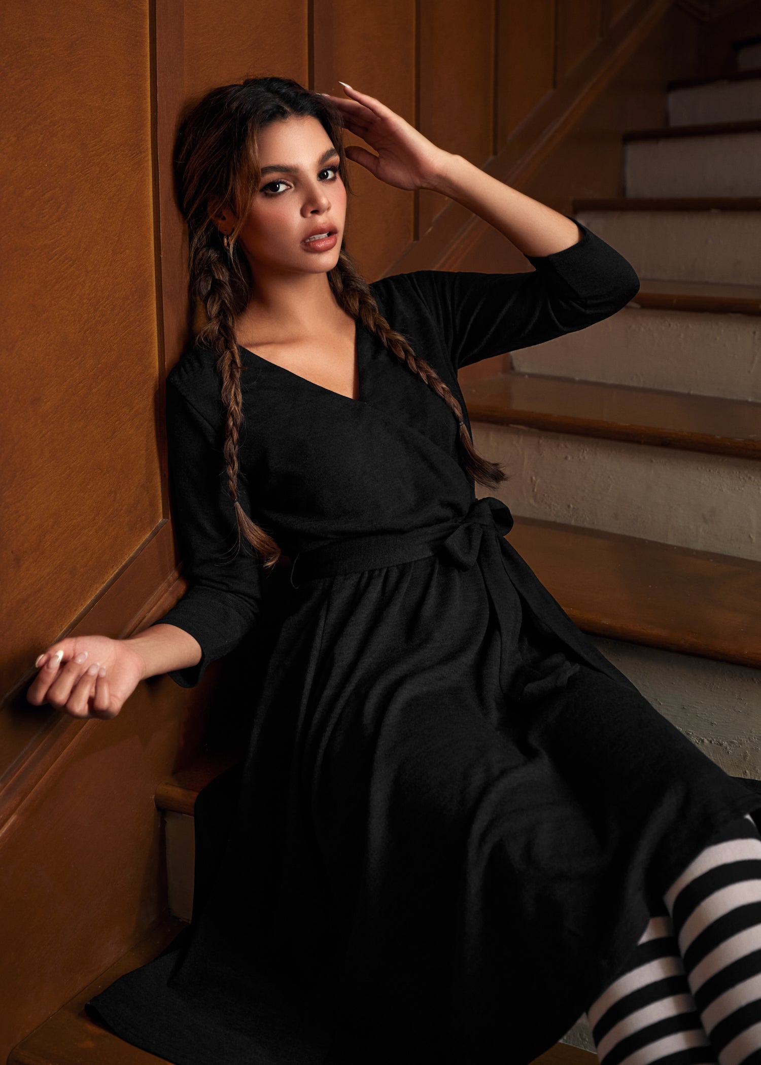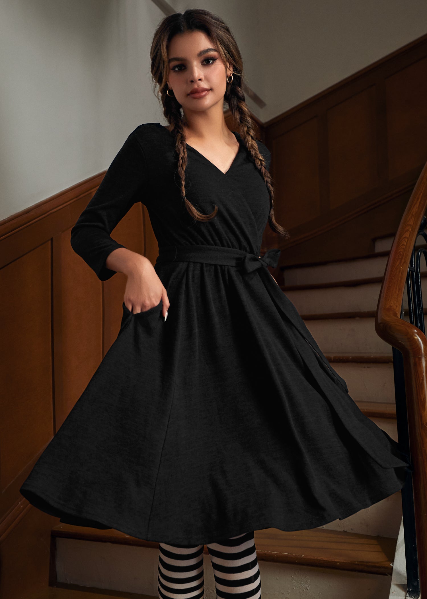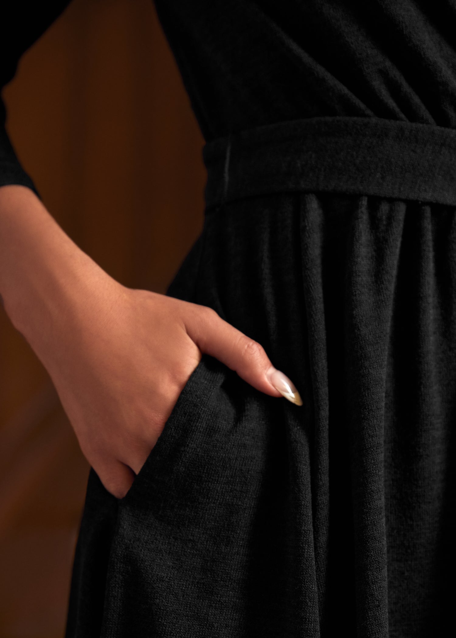 When your wardrobe calls for an instant boost, this faux-wrap knit dress from our ModCloth namesake label delivers. Crafted in classic black, this soft, stretchy piece balances cozy comfort with twirl-worthy elegance. A flattering faux-wrap bodice, long sleeves, and a self-tie waist create timeless shape, while hidden side pockets keep your essentials close. Whether styled with bold tights, polished boots, or your favorite statement earrings, this dress makes effortless chic your default setting.