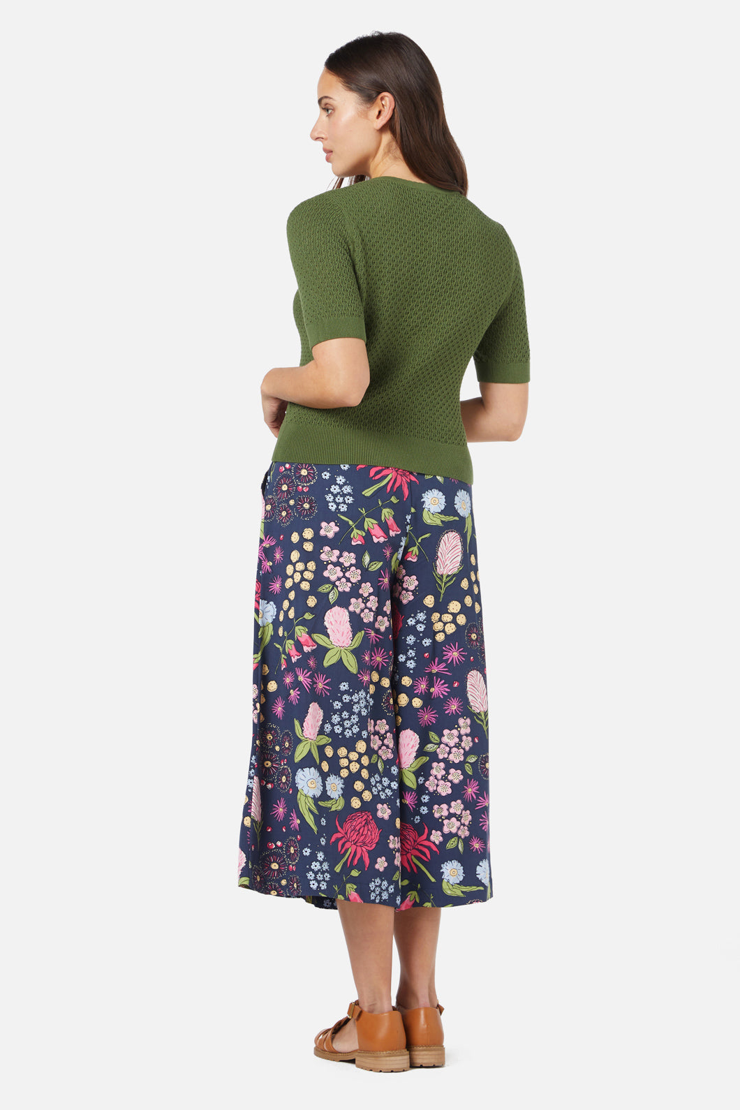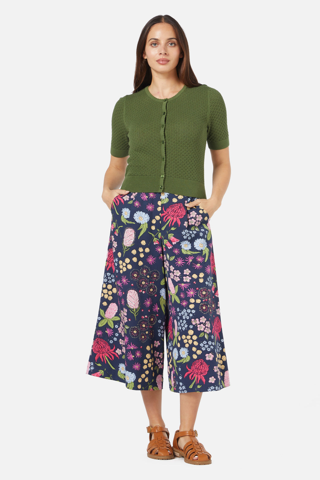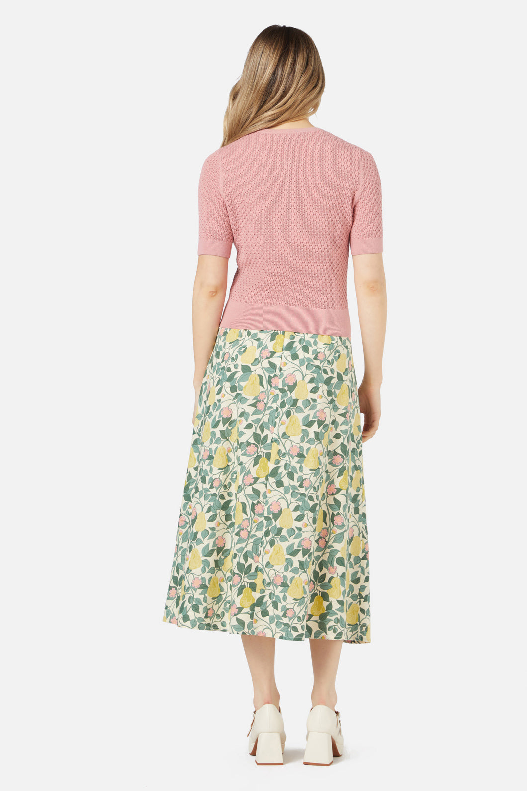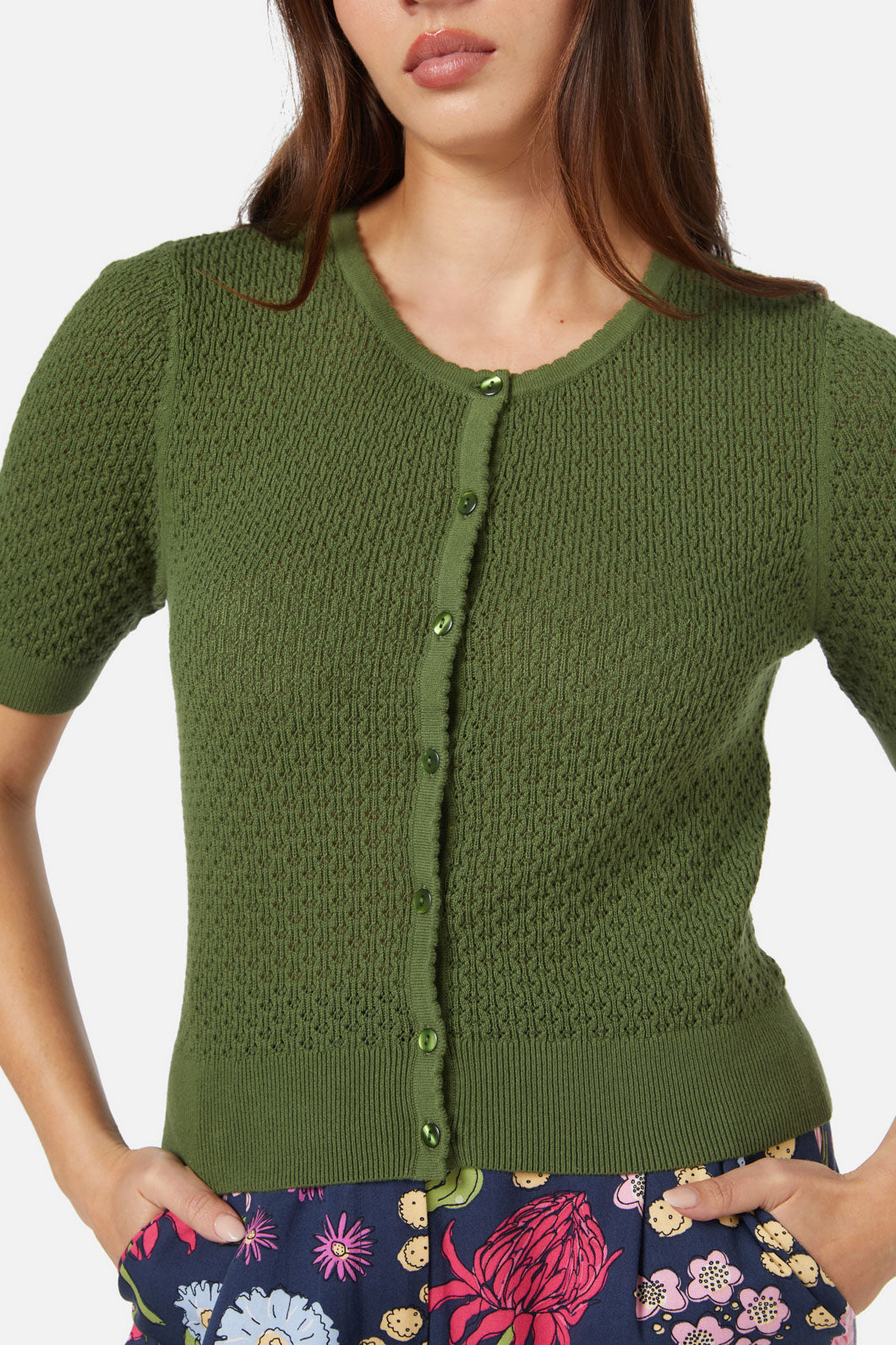 The Isla Cardi offers a charming lace-style knit in a cotton yarn, making it a breathable and versatile piece for any wardrobe. This short-sleeve cardigan features a rounded neckline, button-through front, and ribbed detailing on the neck, cuffs, and hem. Designed with a comfortable amount of stretch, it’s perfect for layering over dresses or pairing with high-waisted pants. Available in olive and pink.