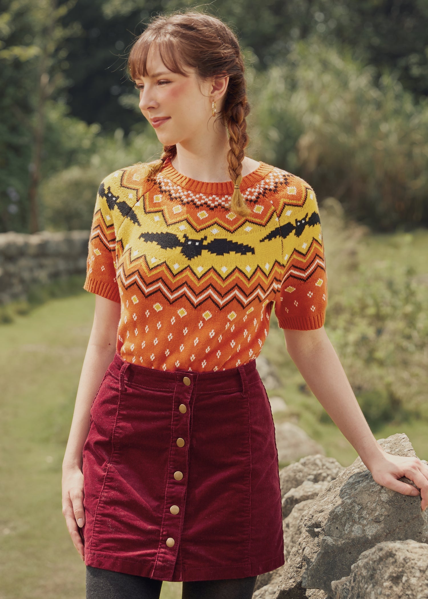 Quirky and ‘bat’ to the bone, this orange short sleeve sweater from our ModCloth namesake label will make any outfit boo-tiful with its exclusive Fair Isle pattern at the yoke featuring flapping black bat motifs that are framed by criss-crosses, stripes, dots, and zig-zags, along with polka-dots scattered all over. Made from a super soft cotton knit, this pullover sweater is a classic crew neck cut in an easy fit that is ideal for cool-weather layering year-round.