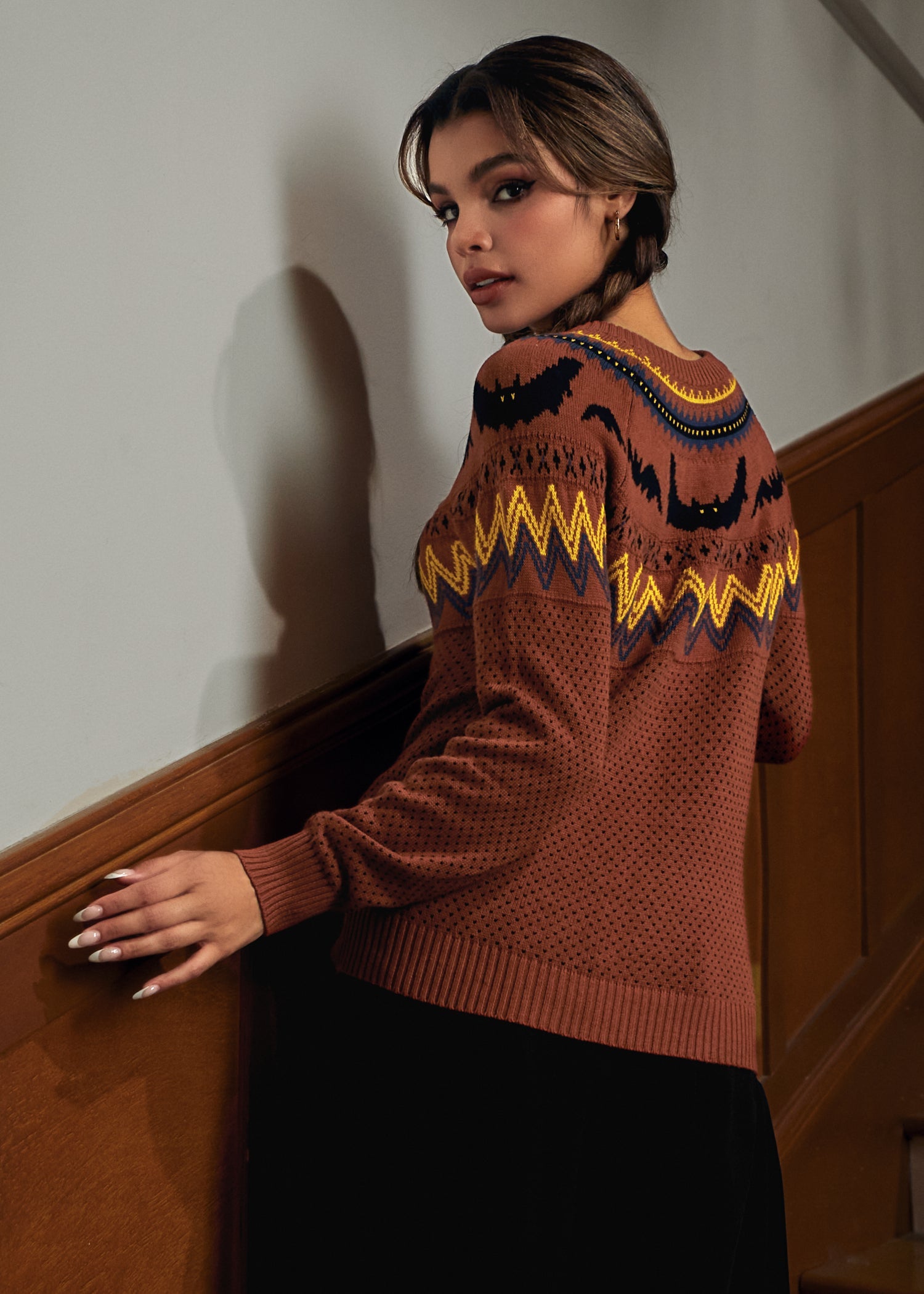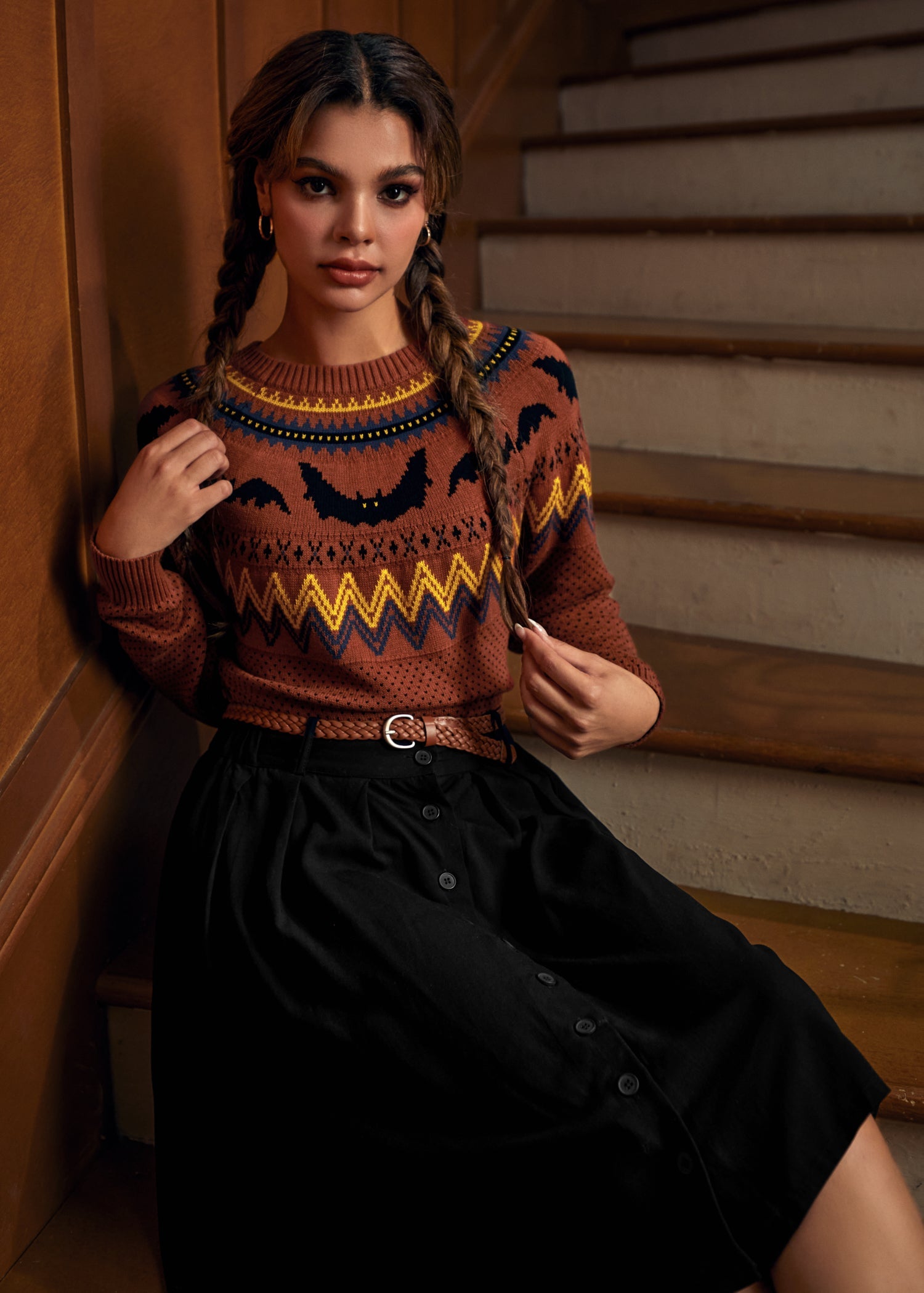 Quirky and ‘bat’ to the bone, this rust-hued sweater from our ModCloth namesake label will make any outfit boo-tiful with its exclusive Fair Isle pattern at the yoke featuring flapping black bat motifs that are framed by criss-crosses, stripes, dots, and zig-zags, along with polka-dots scattered all over. Made from a super soft cotton knit, this pullover sweater is a classic crew neck cut in an easy fit that is ideal for cool-weather layering year-round.