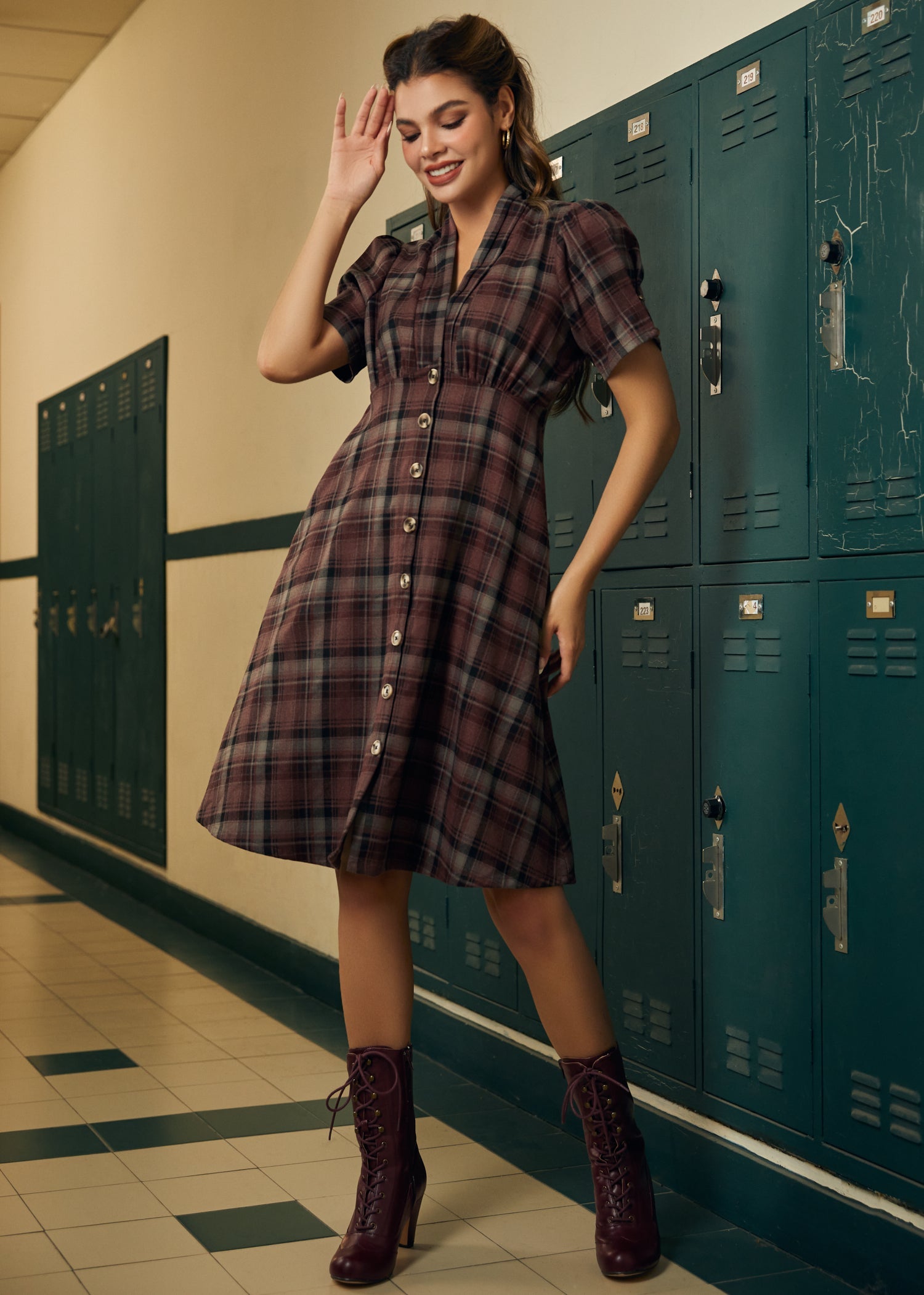 Smart style meets vintage flair in the Ivy League Charm Fit & Flare Dress from our ModCloth namesake label. Designed in Cranberry Scholar Plaid, this beauty features a refined shawl collar, empire waist, and a row of classic buttons for timeless appeal. The hi-low hemline adds a modern edge, while puff sleeves and handy pockets keep it effortlessly wearable. Whether you’re headed to class, a cozy café, or a crisp autumn stroll, this dress is top of the style honor roll.