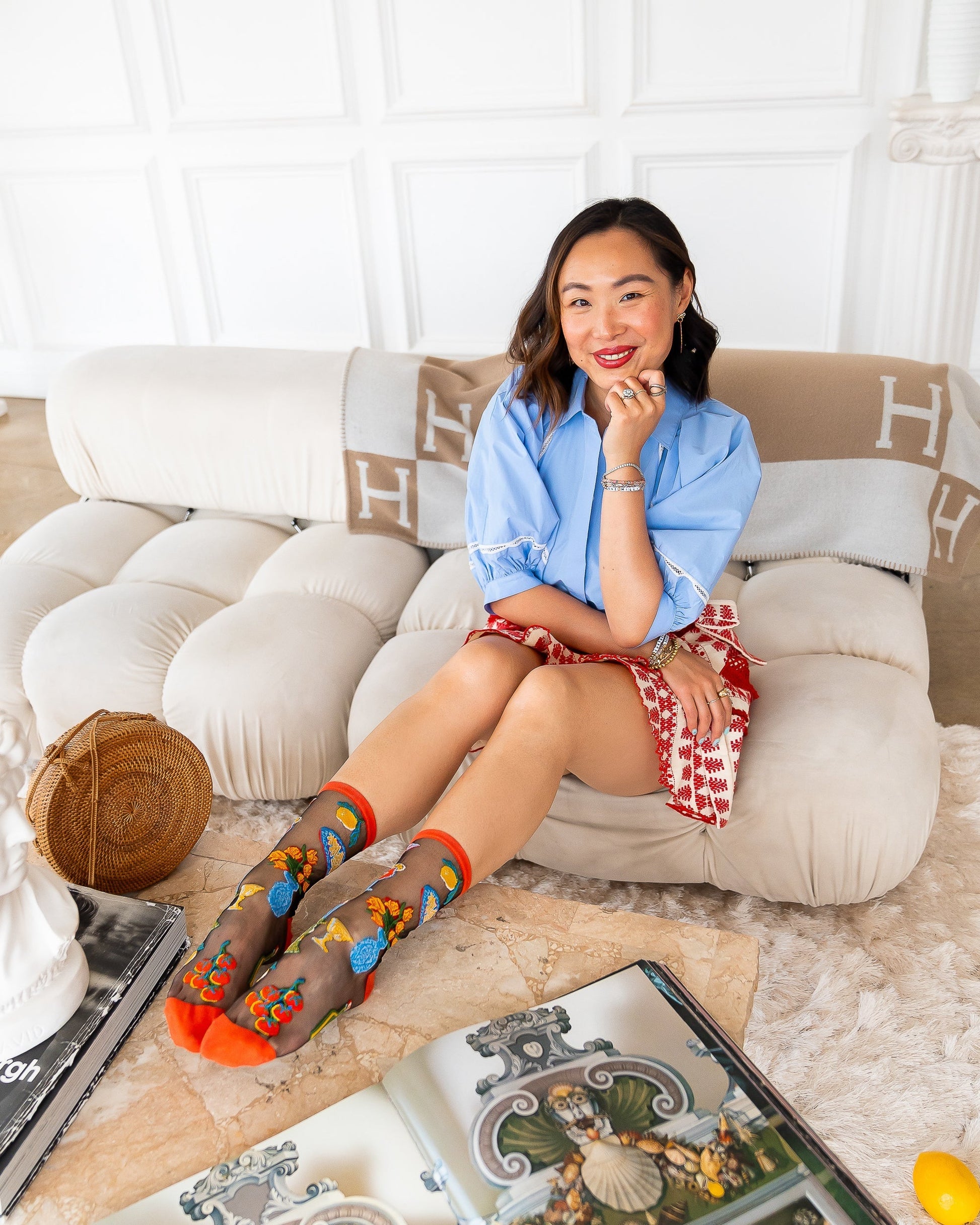 Transport yourself to Italy in our La Dolce Vita black sheer sock, featuring classic elements of an Italian dinner table, complete with fresh pasta and fish, rustic florals, and vintage wine glasses. The perfect Italian summer is within your reach with this mouthwatering sock. Pair with red sandals and an Aperol Spritz.Â