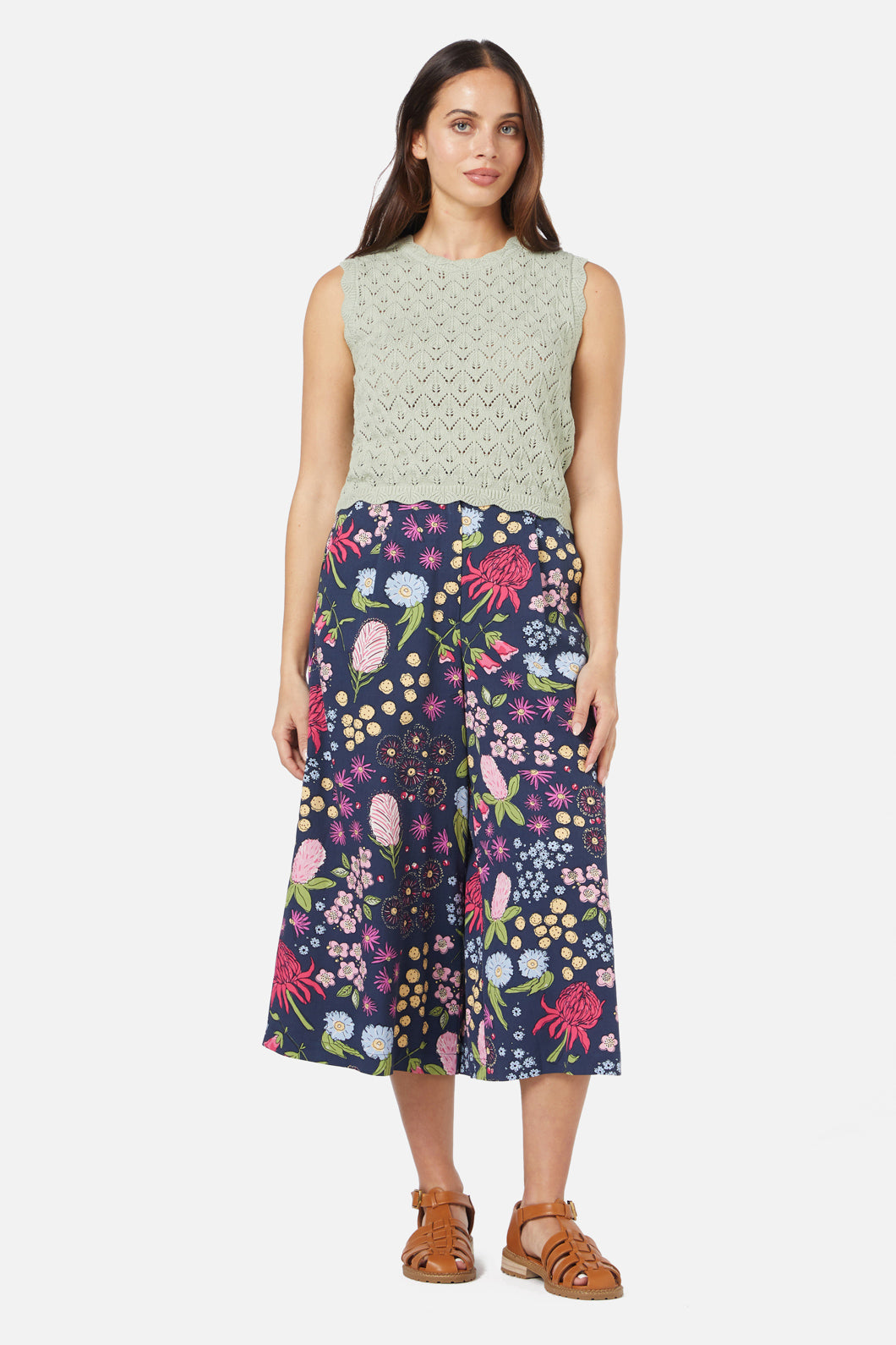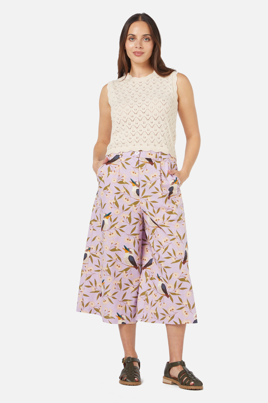 Soft, sweet, and effortlessly vintage—the Lana Pointelle Knit Top by Princess Highway is a dreamy addition to your wardrobe. Crafted in a delicate diamond pointelle knit, this sage green and cream beauty brings a touch of nostalgic charm to any outfit. Featuring a round neckline, cropped length, and sleeveless style, it's perfect for layering or wearing solo on sunny days. The scalloped edging along the neckline, armholes, and hem adds a dainty, feminine touch, making this top as enchanting as a stroll through a wildflower meadow.
