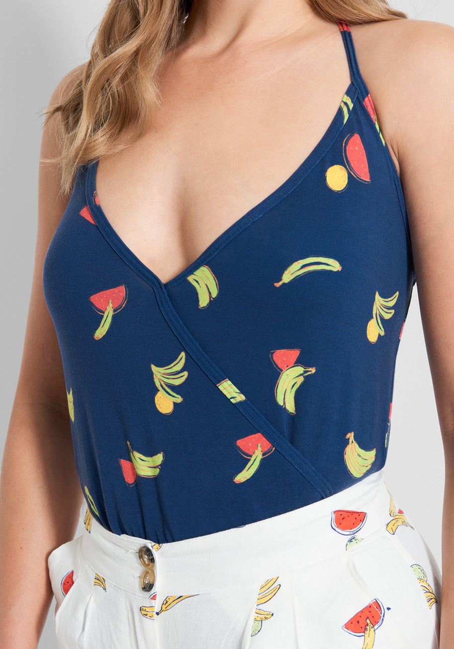 It won't take long at all to get yourself noticed for all the right 1970s-inspired style reasons when you rock this ModCloth namesake label bodysuit this summer. Made from a soft, drapey - and a little stretchy - rayon jersey knit in a navy blue hue, this halter neck one-piece boasts a retro-fab, vintage-inspired fruit print made-up of yellow bananas, red watermelon slices, and round oranges, that is here to resuscitate your summer wardrobe. We love the surplice neckline and classic halter neck-tie closure, as both keep the vintage-esque vibes truly alive and well this summer. Ideal for wearing under high-rise flared jeans on or under high-rise denim cutoff shorts for an easy to put together, flirty ensemble.