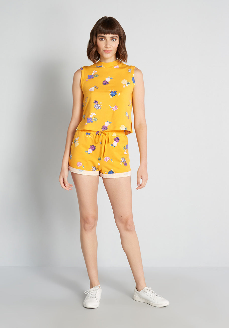 Get to the ease of your days and nights in this yellow ModCloth namesake label sleeveless tee. Made from a soft, breathable French terry knit, this top is a perfect, casual addition to your spring and summer wardrobe that still takes into account the need to relax. Featuring an all over print of our exclusive Neon Rose print that is made-up of multicolored, hand-illustrated rose motifs in bright neon hues of pink, blue, purple, yellow, and a solid white, that are scattered throughout, this tank is sure to pair well with just about anything, especially their matching shorts! With a mock neck and a subtly boxt fit, this sleeveless T-shirt is just as comfy as it is stylish.