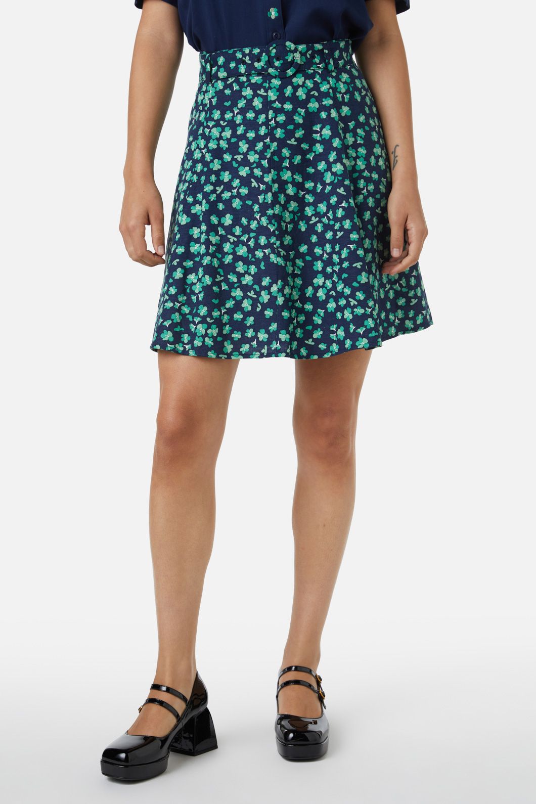 Let the Mille Fleur Skirt whisk you away on a botanical breeze, where romantic floating blossoms dot a darling ditsy floral landscape. This sweet paneled mini skirt, gracefully clinched at the waist with a matching belt, is your ticket to turning everyday moments into scenes from a whimsical garden. Complete with belt loops and a removable round buckle belt, it offers the perfect fit to flatter your figure. The back zip and button closure ensure slipping into this blooming beauty is as effortless as a petal drifting on the wind. Finishing just above the knee and crafted from a linen-viscose blend, it’s the ideal blend of comfort and chic style. Let every stride be a garden path with the Mille Fleur Skirt, where fashion meets flora in a dance of elegance and ease.