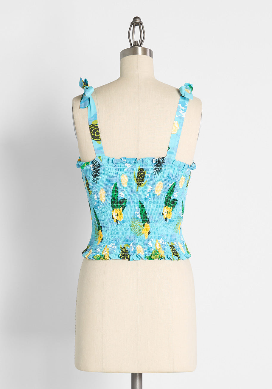 All aboard for a tropical soiree in this blue smocked tank top from our latest ModCloth x Collectif collab! Boasting an exclusive print of green sea turtles, ivory seashells, and bundles of lush green palm fronds accompanied by cheerful yellow blossoms over a seeming reflective background of swirling shades blue that imitate the crystalline water’s surface, this darling is full of vintage-inspired charm. Featuring comfy smocking throughout, darling tie-shoulder tank straps, ruffle trim detailing at the edges, and a vintage-inspired cropped silhouette, this sleeveless top will make you feel like you’re on vacation from the moment you put it on.Â