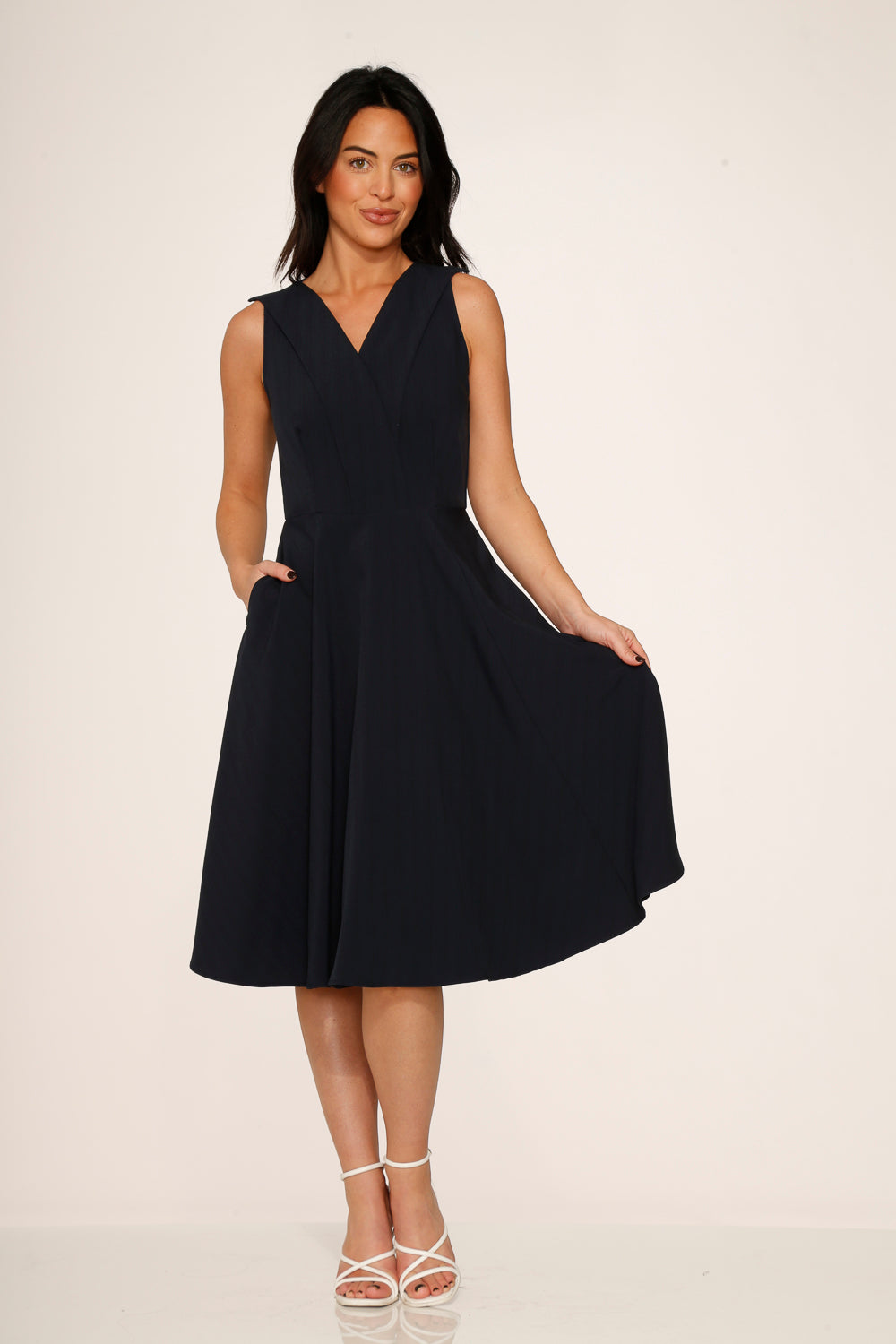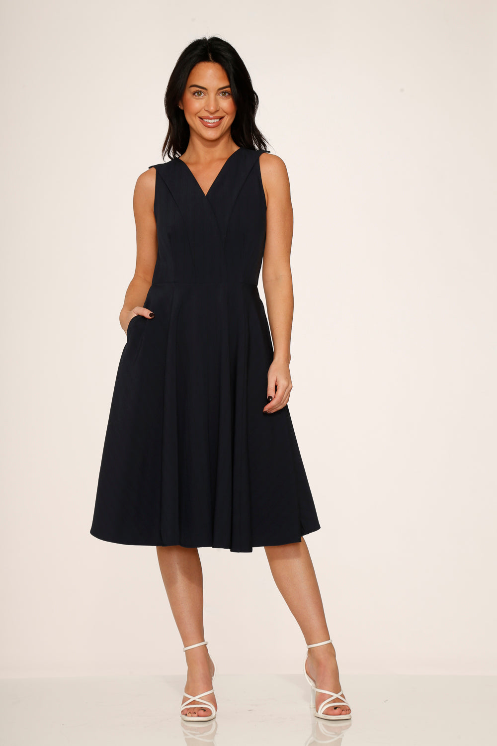Timeless, tailored, and oh-so-twirlable—the Orchid Bloom Navy Blue Swing Dress is your new vintage-inspired staple. Featuring a graceful V-neckline, flattering fitted bodice, and full A-line skirt with pockets (yes, pockets!), this beauty brings effortless elegance to workdays, weddings, and everything in between.