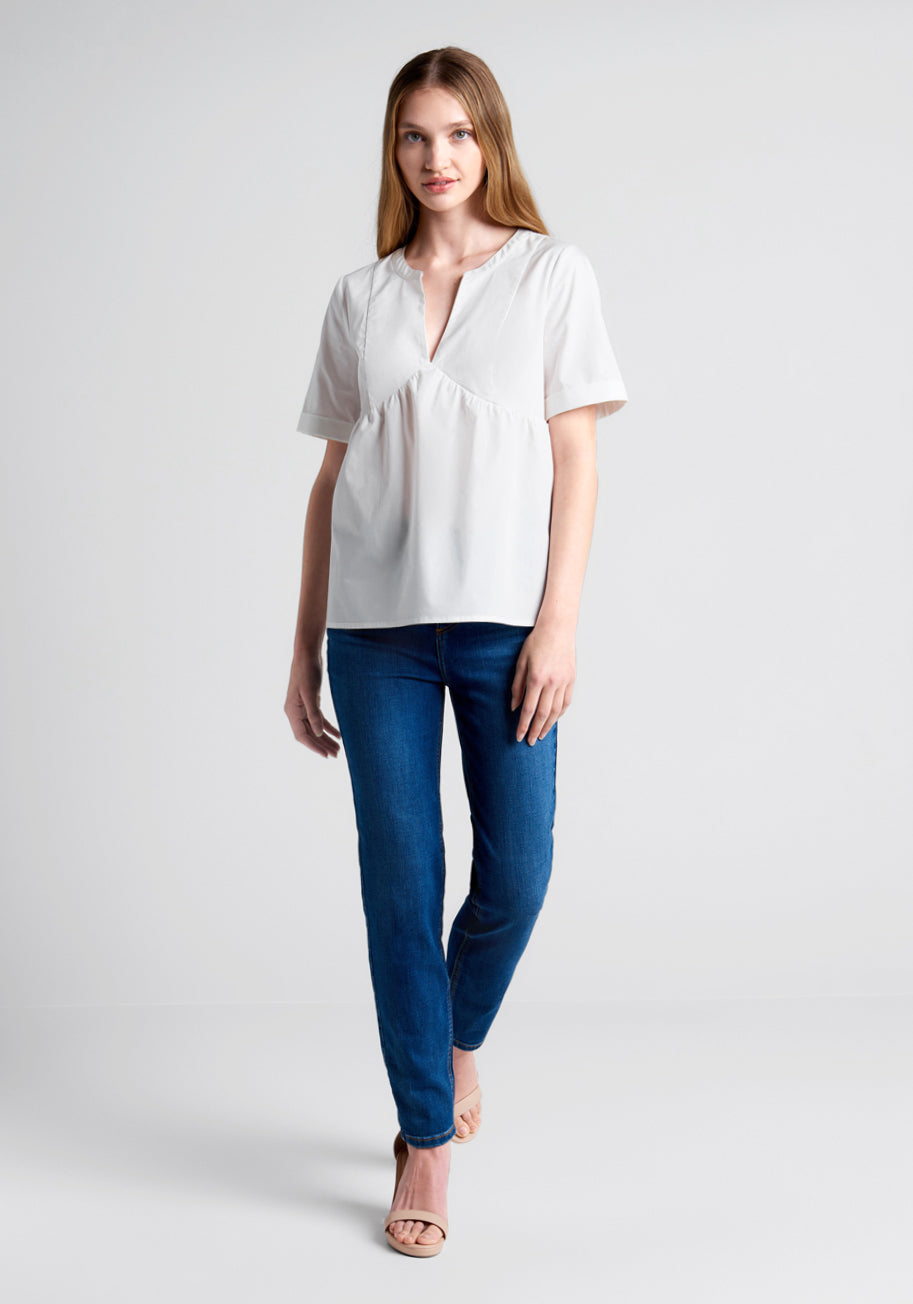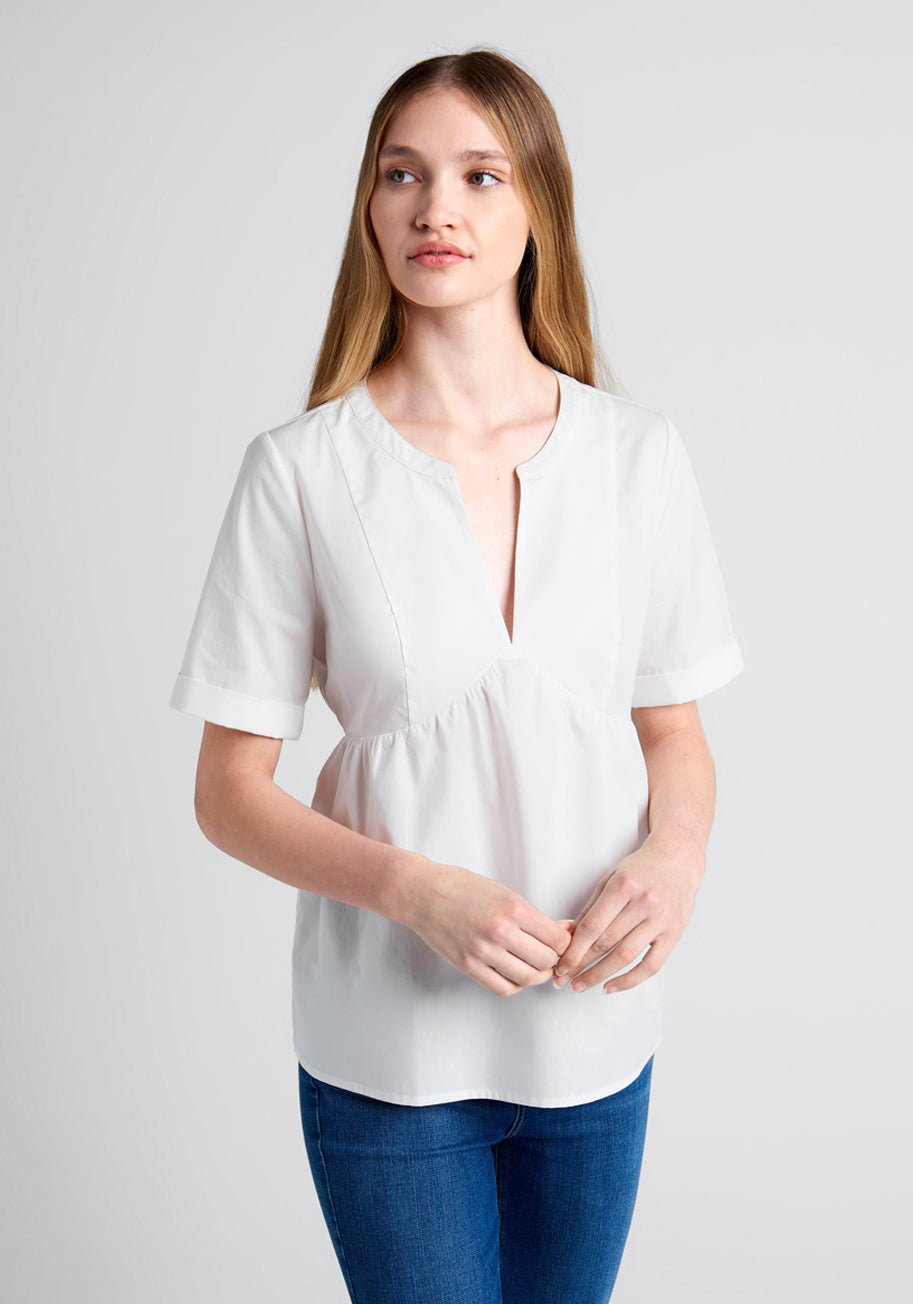 In a crisp ivory hue, this 70’s-inspired cotton top from our ModCloth namesake label is so refreshingly unique. Made from a cotton poplin weave, this easy-fit top boasts short sleeves with fold-over cuffs, a deep Y-neckline, and gathered detailing at the bustline that gives way to a retro-chic, boxy silhouette.