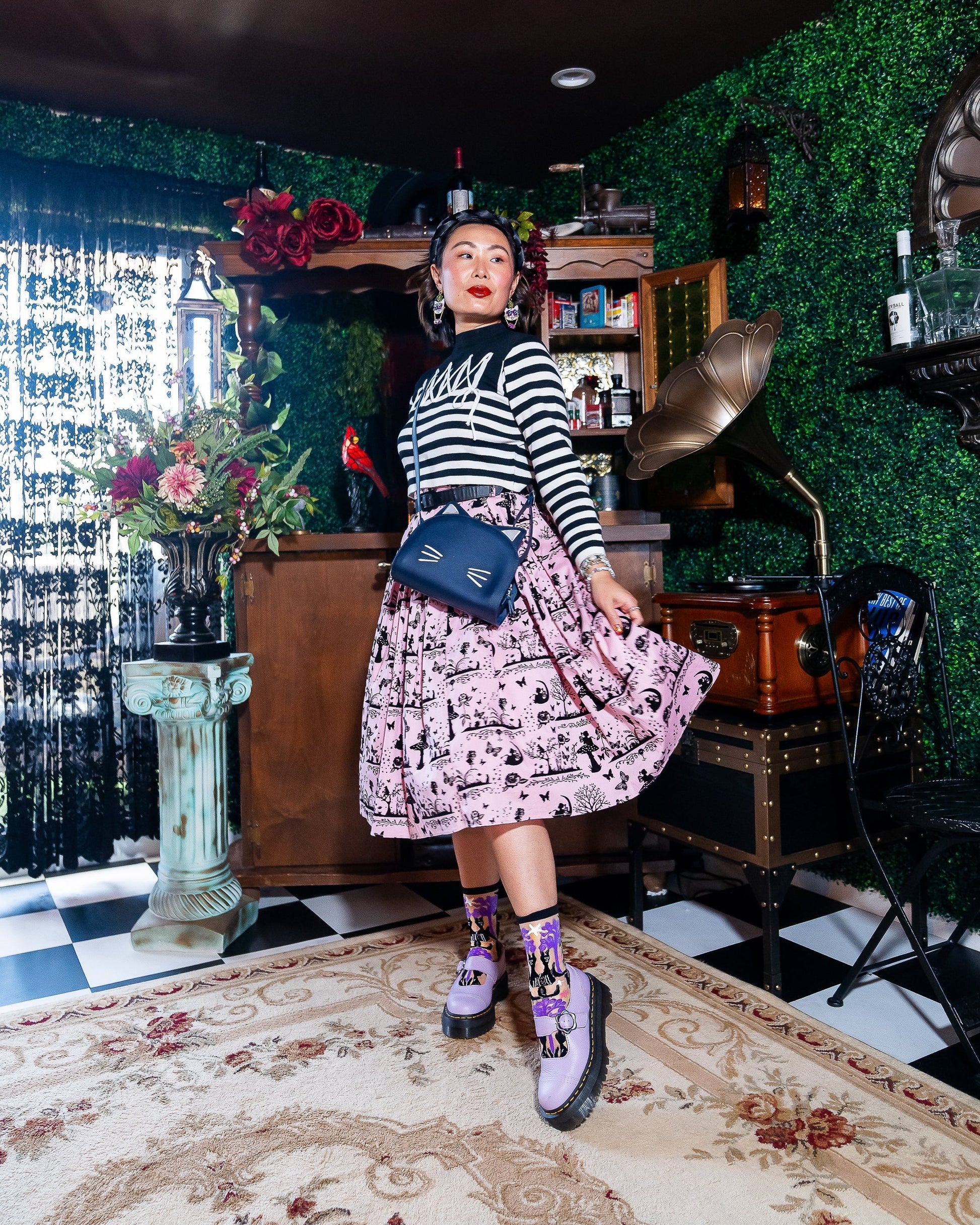 Our bestselling Dopamine Cats socks are now available as Nocturnal cats for Halloween season. Set in a mirrored layout, black cats with pink dots are surrounded by squiggly trees, moons and stars in a purple, black, and blush pink color palette. The perfect unexpected accessory for all your Fall and Halloween outfits.