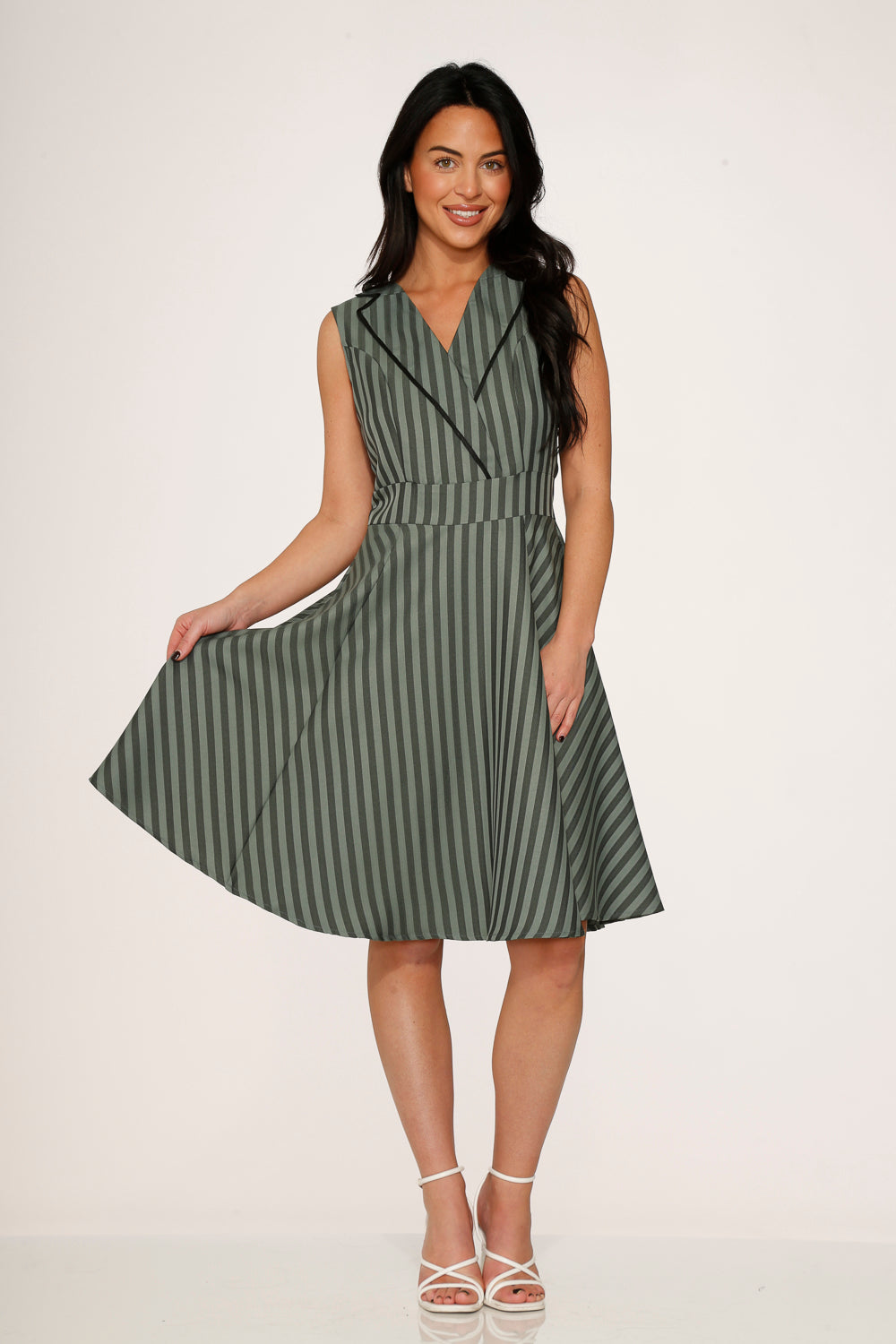 With crisp vertical stripes and a tailored lapel neckline, the Orchid Bloom Olive Stripe Swing Dress brings just the right mix of vintage charm and modern edge. A flattering fit-and-flare silhouette and structured waistband make it perfect for everything from desk duty to dinner dates.