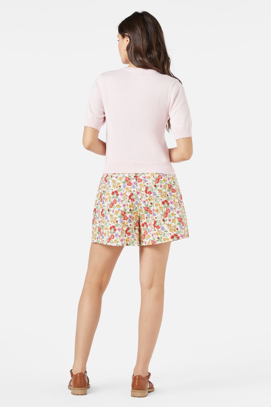 Scalloped edges at the neckline, sleeves, and hem for a vintage-inspired finish