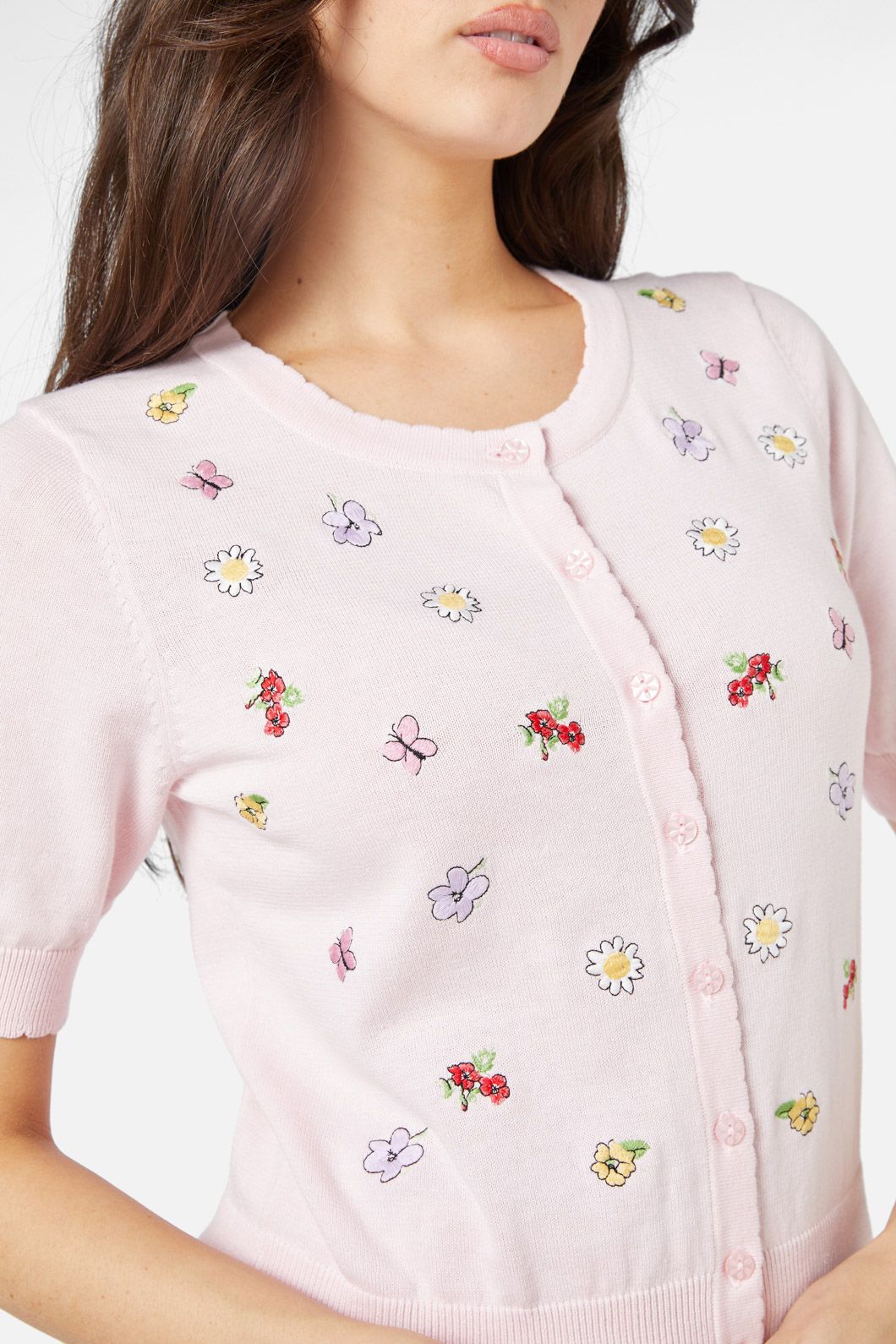Let your style take flight with the Papillon Embroidered Cardi. This sweet summer knit features delicate butterfly and flower embroidery scattered across the front—perfect for adding a soft, whimsical touch to any outfit.
