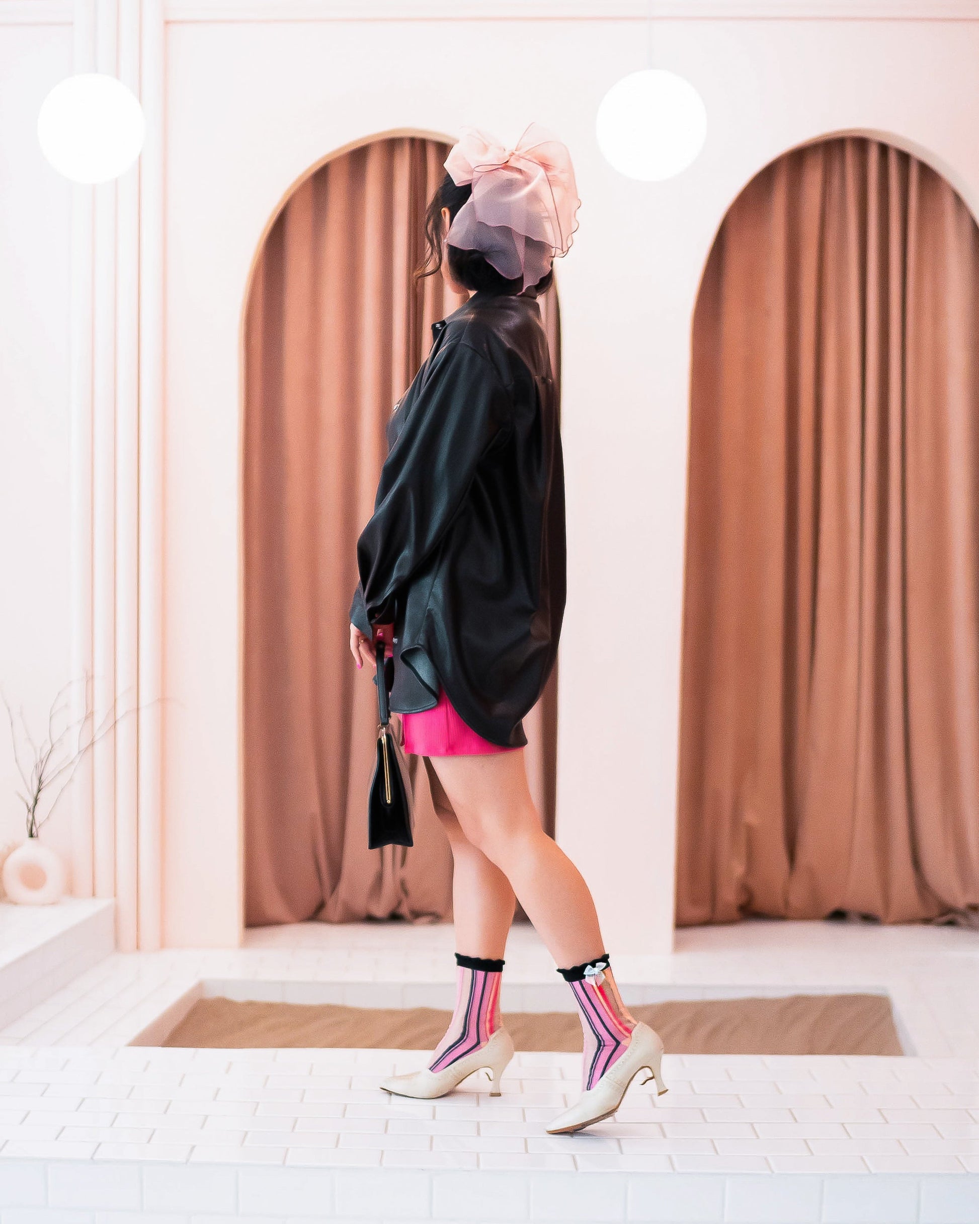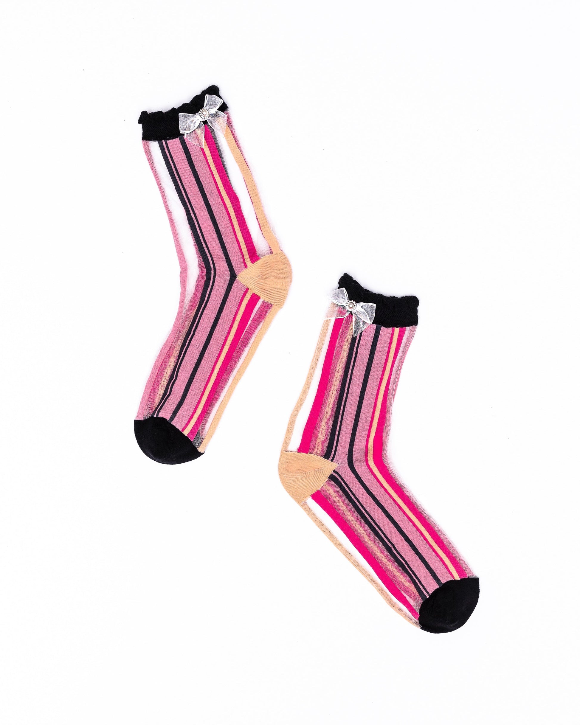 Inspired by quintessential French girl style, our Parisian Stripes sock features classic pink, black and sheer stripes adorned with a sheer white bow and black ruffle cuff. We chose black and nude for the toe and heel for the perfect timeless touch. You'll feel like you're in Paris in no time when paired with pointy pumps and a hair bow.Â