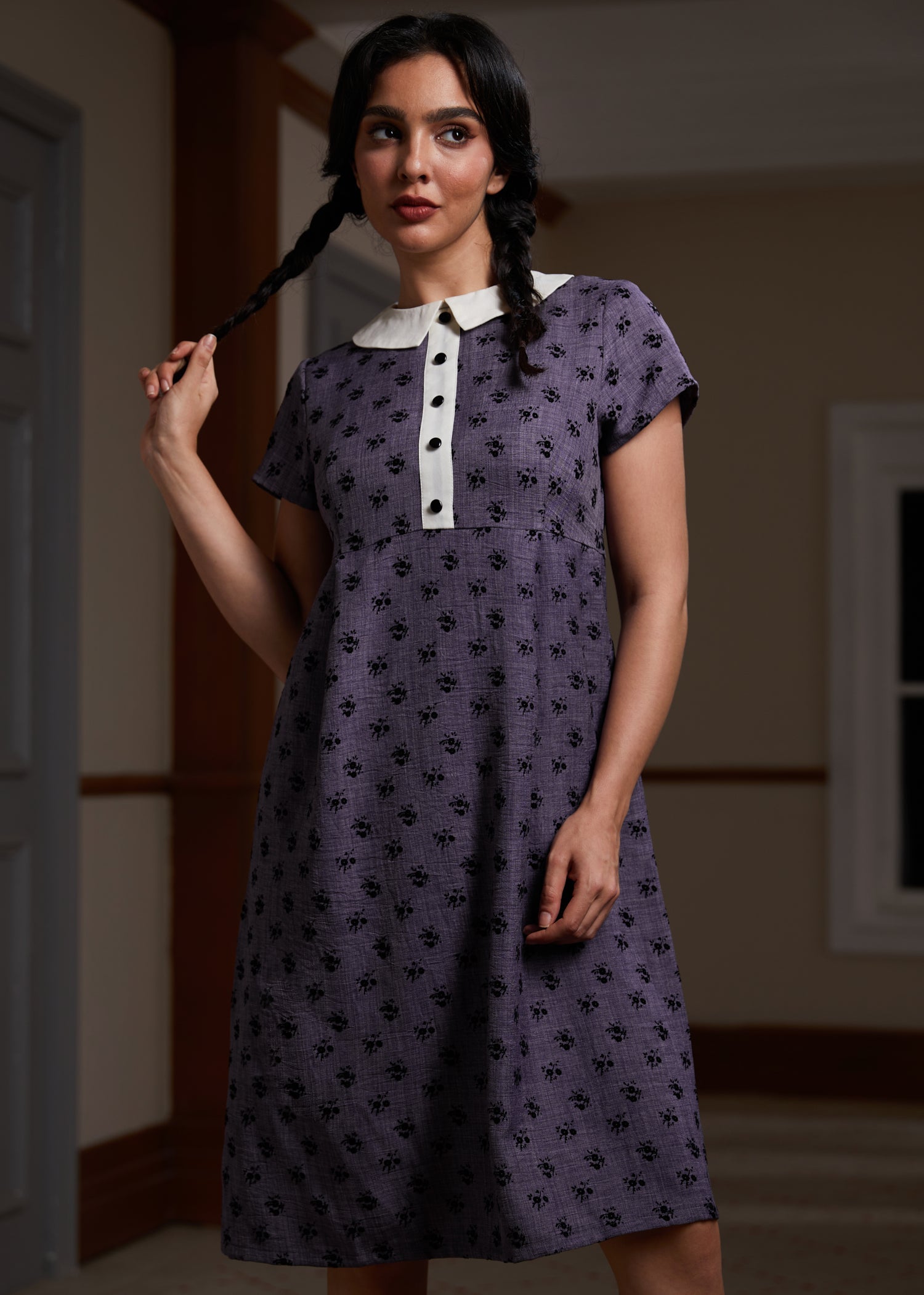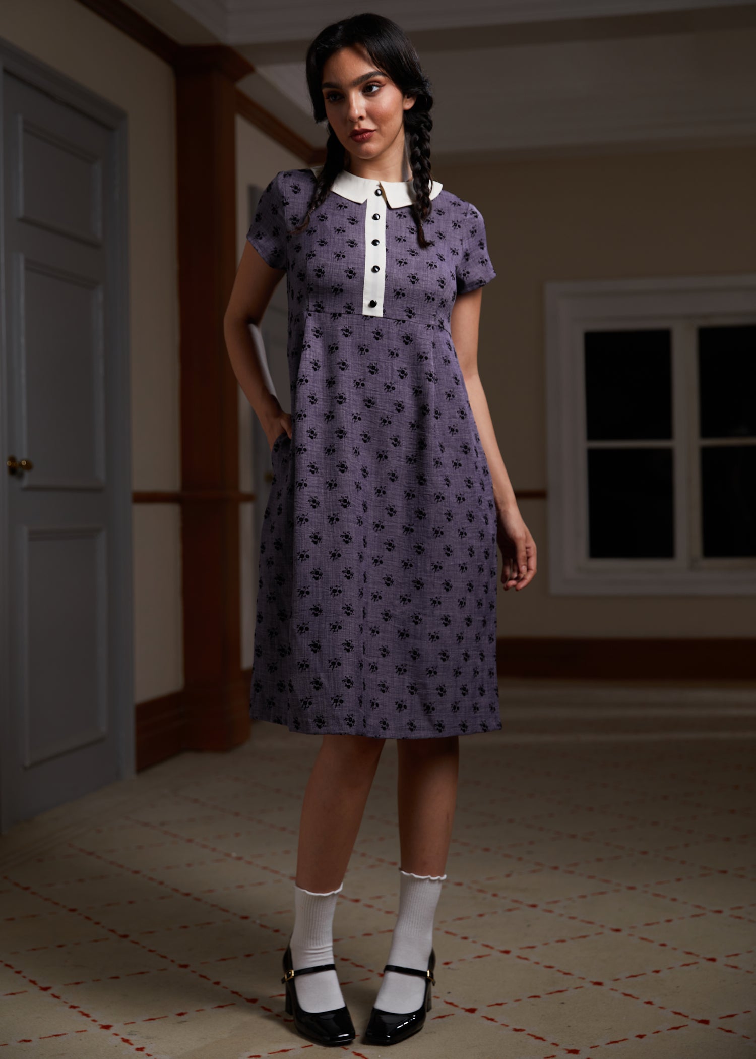 Pumpkin Patch Shirtwaist Dress from our ModCloth namesake label invites you to embrace the season's festivities. Swathed in a black flower print, this dress features a woven purple fabric with a knit feel and handy pockets for your autumnal trinkets. With a nifty zipper and contrast trim, this dress is a playful frock for weekend jaunts to the pumpkin patch or a whimsical workday ensemble.