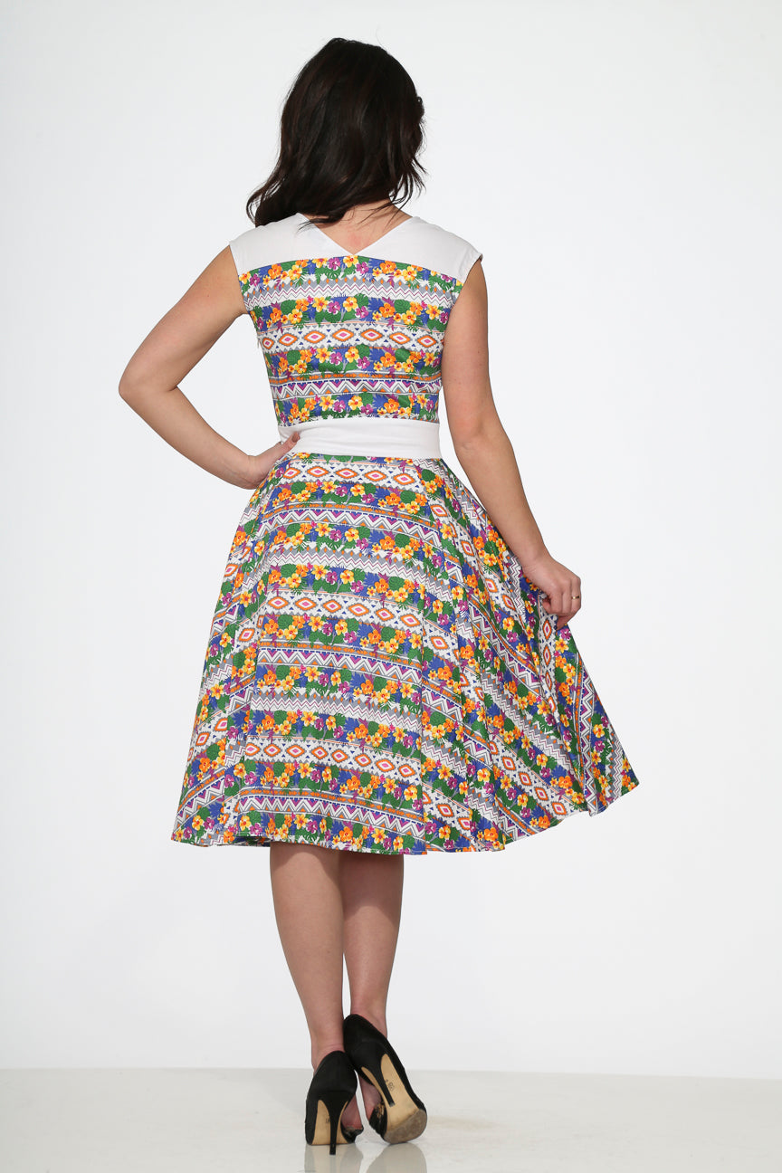 Made from a breathable cotton-spandex blend, it offers a comfortable stretch and flattering fit. Finished with a center back zipper and side pockets, this dress combines beauty with everyday practicality.