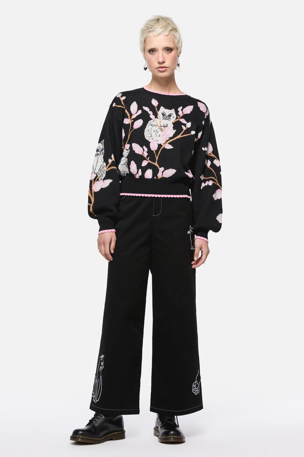 Snuggle up in vintage-inspired charm with the Pussy Willow Border Knit by Dangerfield. This oversized cotton jumper features an irresistibly cute ‘Pussy Willow’ kitty artwork on the front—perfect for cat lovers and retro dreamers alike. With its relaxed fit, round neckline, and ribbed trims, it’s your go-to knit for cozy winter layering.